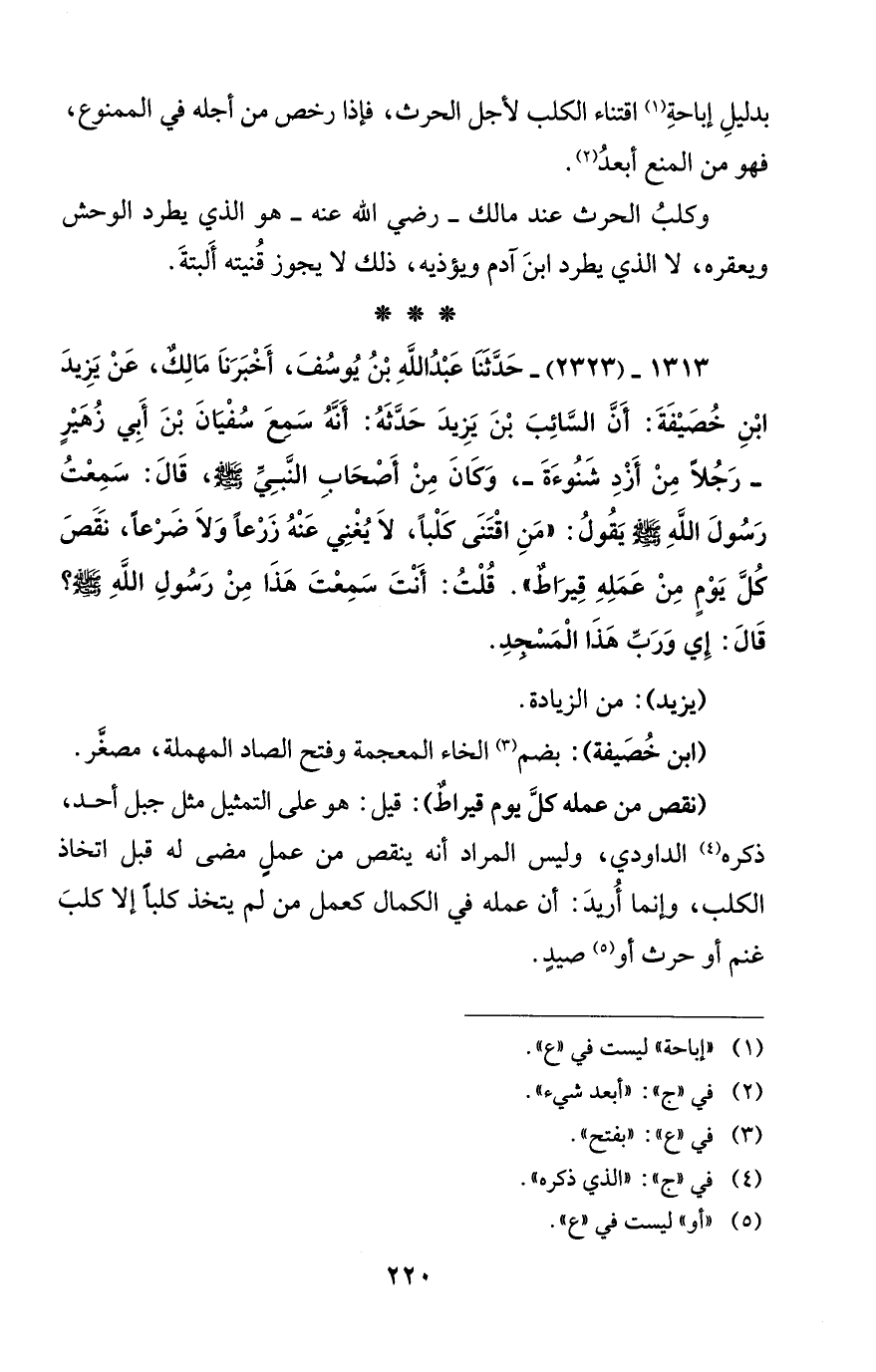 1313 - (2323) - حَدَّثَنَا عَبْدُ اللهِ بْنُ يُوسُفَ، أَخْبَرَنَا مَالِكٌ، عَنْ يَزِيدَ ابْنِ خُصَيْفَةَ: أَنَّ السَّائِبَ بْنَ يَزِيدَ حَدَّثَهُ: أَنَّهُ سَمِعَ سُفْيَانَ بْنَ أَبِي زُهَيْرٍ -رَجُلًا مِنْ أَزْدِ شَنُوءَةَ-، وَكَانَ مِنْ أَصْحَابِ النَّبِيِّ - صلى الله عليه وسلم -، قَالَ: سَمِعْتُ رَسُولَ اللهِ - صلى الله عليه وسلم - يَقُولُ: "مَنِ اقْتَنَى كلْباً، لَا يُغْنِي عَنْهُ زَرْعاً وَلَا ضَرْعاً، نَقَصَ كُلَّ يَوْمٍ مِنْ عَمَلِهِ قِيرَاطٌ". قُلْتُ: أَنْتَ سَمِعْتَ هَذَا مِنْ رَسُولِ اللهِ - صلى الله عليه وسلم -؟ قَالَ: إَي وَرَبِّ هَذَا الْمَسْجِدِ.