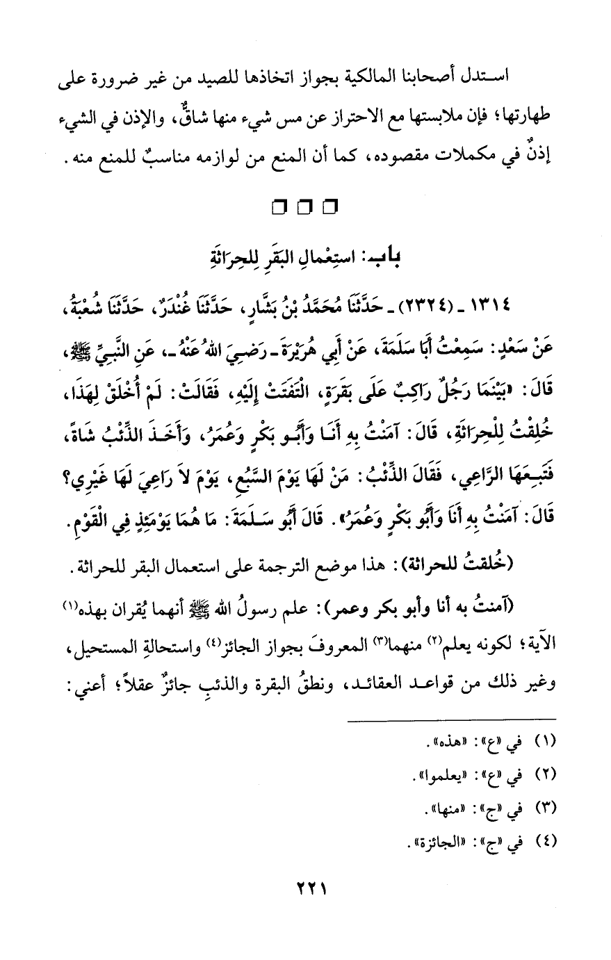 1314 - (2324) - حَدَّثَنَا مُحَمَّدُ بْنُ بَشَّارٍ، حَدَّثَنَا غُنْدَرٌ، حَدَّثَنَا شُعْبَةُ، عَنْ سَعْدٍ: سَمِعْتُ أَبَا سَلَمَةَ، عَنْ أَبِي هُرَيْرَةَ -رَضِيَ اللهُ عَنْهُ-، عَنِ النَّبِيِّ - صلى الله عليه وسلم -، قَالَ: "بَيْنَمَا رَجُلٌ رَاكِبٌ عَلَى بَقَرَةٍ، الْتَفَتَتْ إِلَيْهِ، فَقَالَتْ: لَمْ أُخْلَقْ لِهَذَا، خُلِقْتُ لِلْحِرَاثَةِ، قَالَ: آمَنْتُ بِهِ أَنَا وَأبُو بَكْرٍ وَعُمَرُ، وَأَخَذَ الذِّئْبُ شَاةً، فَتَبِعَهَا الرَّاعِي، فَقَالَ الذِّئْبُ: مَنْ لَهَا يَوْمَ السَّبُعِ، يَوْمَ لَا رَاعِيَ لَهَا غَيْرِي؟ قَالَ: آمَنْتُ بِهِ أَنَا وَأَبُو بَكْرٍ وَعُمَرُ". قَالَ أَبُو سَلَمَةَ: مَا هُمَا يَوْمَئِذٍ فِي الْقَوْمِ.