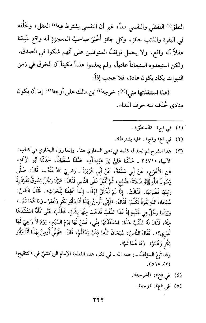 النطق (¬1) اللفظي والنفسي معاً، غير أن النفسي يشترط فيه (¬2) العقل، وخَلْقه في البقرة والذئب جائز، وكل جائز أَخْبَرَ صاحبُ المعجزةِ أنه واقع عَلِمْنا عقلاً أنه واقع، ولا يحمل توقفُ المتوقفين على أنهم شكوا في الصدق، ولكن استبعدوه استبعاداً عادياً، ولم يعلموا علماً مكيناً أن الخرق في زمن النبوات يكاد يكون عادة، فلا عجب إذاً.