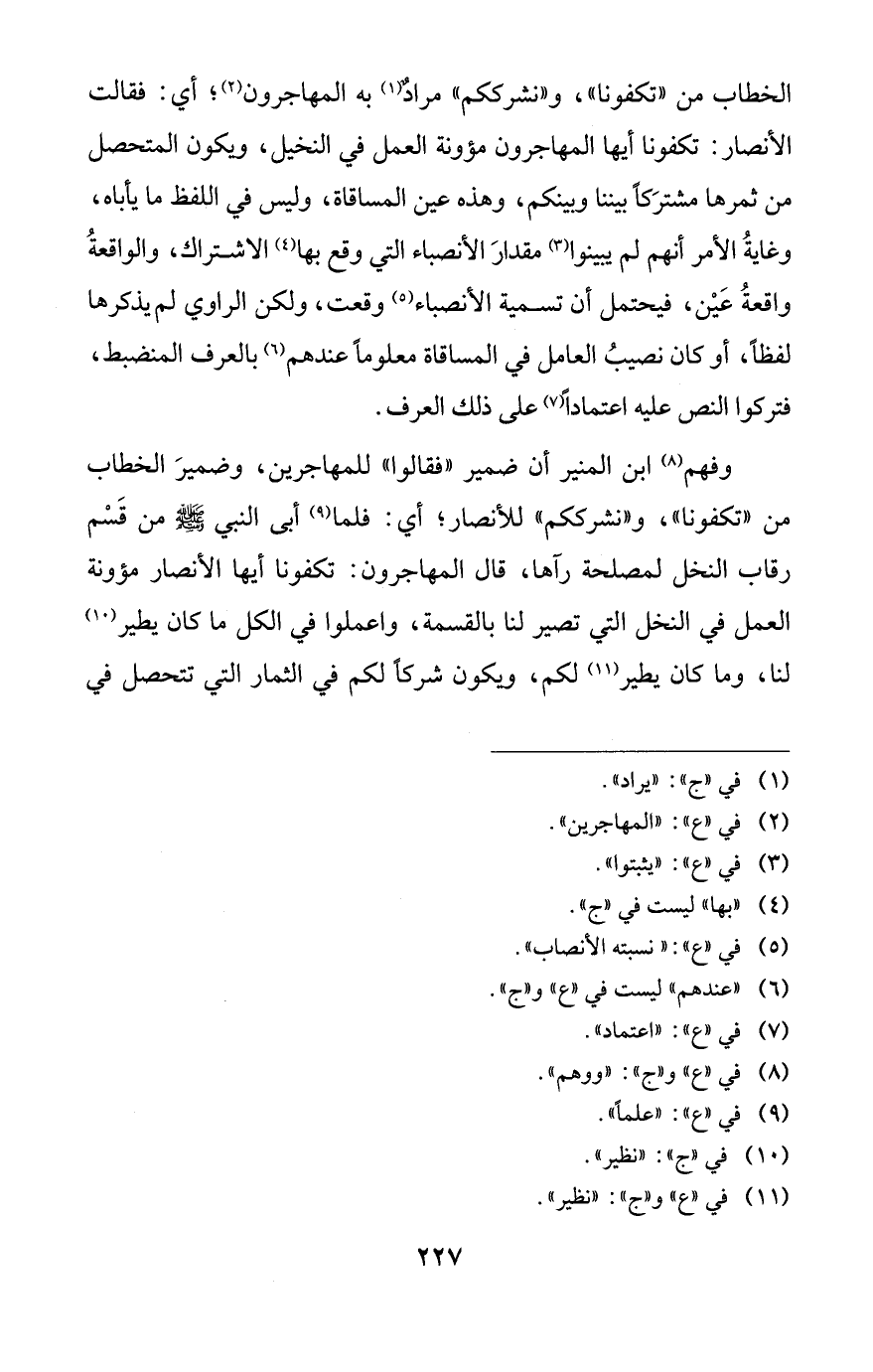 الخطاب من "تكفونا"، و"نشرككم" مرادٌ (¬1) به المهاجرون (¬2)؛ أي: فقالت الأنصار: تكفونا أيها المهاجرون مؤونة العمل في النخيل، ويكون المتحصل من ثمرها مشترَكاً بيننا وبينكم، وهذه عين المساقاة، وليس في اللفظ ما يأباه، وغايةُ الأمر أنهم لم يبينوا (¬3) مقدارَ الأنصباء التي وقع بها (¬4) الاشتراك، والواقعةُ واقعةُ عَيْن، فيحتمل أن تسمية الأنصباء (¬5) وقعت، ولكن الراوي لم يذكرها لفظاً، أو كان نصيبُ العامل في المساقاة معلوماً عندهم (¬6) بالعرف المنضبط، فتركوا النص عليه اعتماداً (¬7) على ذلك العرف.