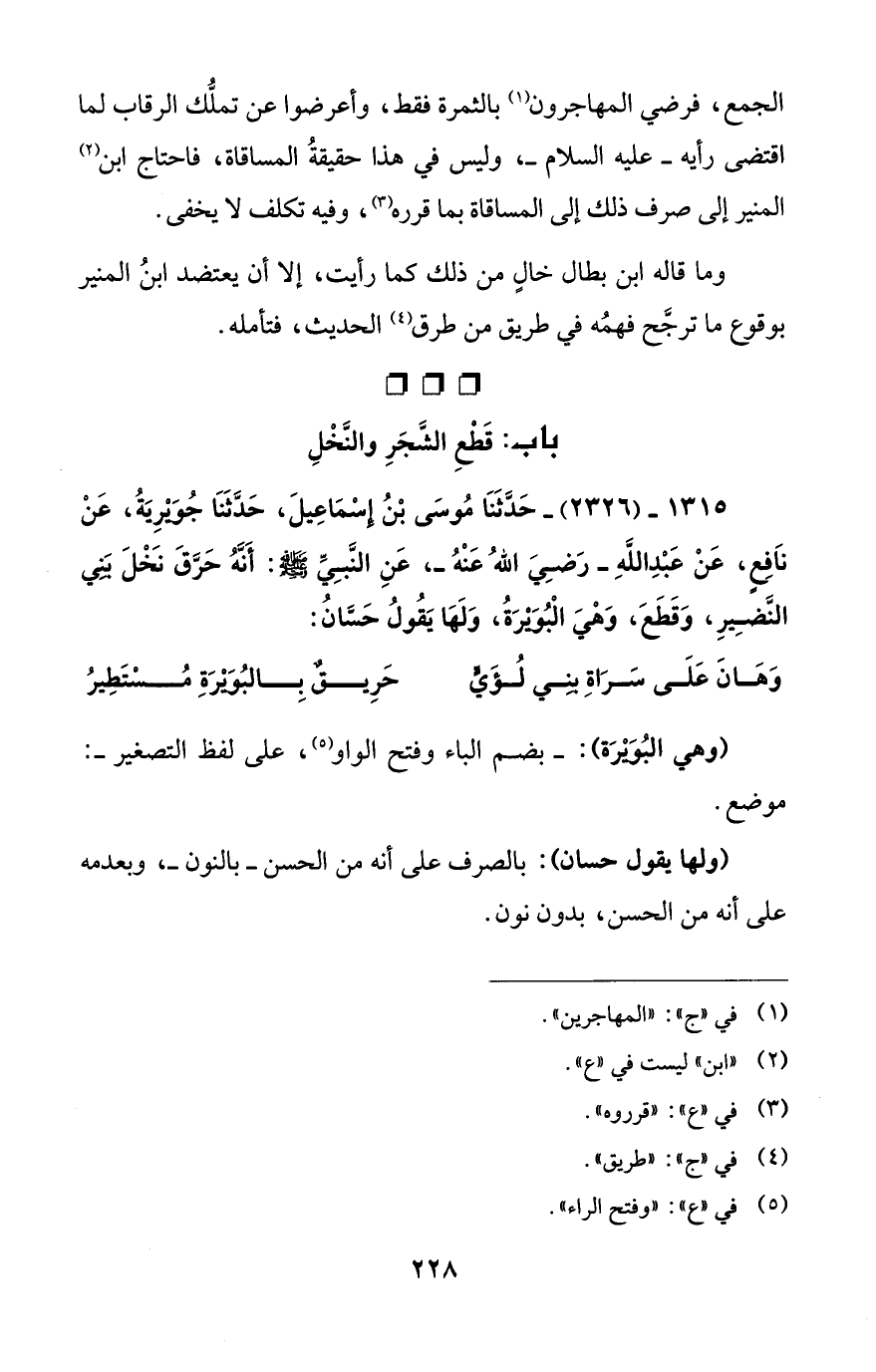 1315 - (2326) - حَدَّثَنَا مُوسَى بْنُ إسْمَاعِيلَ، حَدَّثَنَا جُوَيْرِيَةُ، عَنْ نَافِعٍ، عَنْ عَبْدِ اللهِ -رَضِيَ اللهُ عَنْهُ-، عَنِ النَّبِيِّ - صلى الله عليه وسلم -: أَنَّهُ حَرَّقَ نَخْلَ بَنِي النَّضيِرِ، وَقَطَعَ، وَهْيَ الْبُوَيْرَةُ، وَلَهَا يَقُولُ حَسَّانُ: