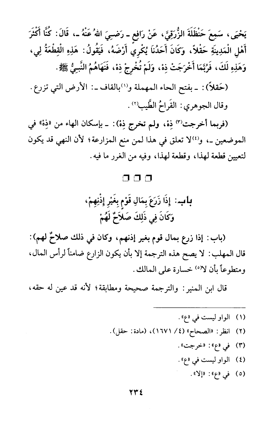 يَحْيىَ، سَمِعَ حَنْظَلَةَ الزُّرَقِيَّ، عَنْ رَافِعٍ -رَضِيَ اللهُ عَنْهُ-، قَالَ: كُنَّا أَكْثَرَ أَهْلِ الْمَدِينَةِ حَقْلاً، وَكَانَ أَحَدُنَا يُكْرِي أَرْضَهُ، فَيَقُولُ: هَذِهِ الْقِطْعَةُ لِي، وَهَذِهِ لَكَ، فَرُبَّمَا أَخْرَجَتْ ذِهْ، وَلَمْ تُخْرِجْ ذِهْ، فَنَهَاهُمُ النَّبِيُّ - صلى الله عليه وسلم -.
