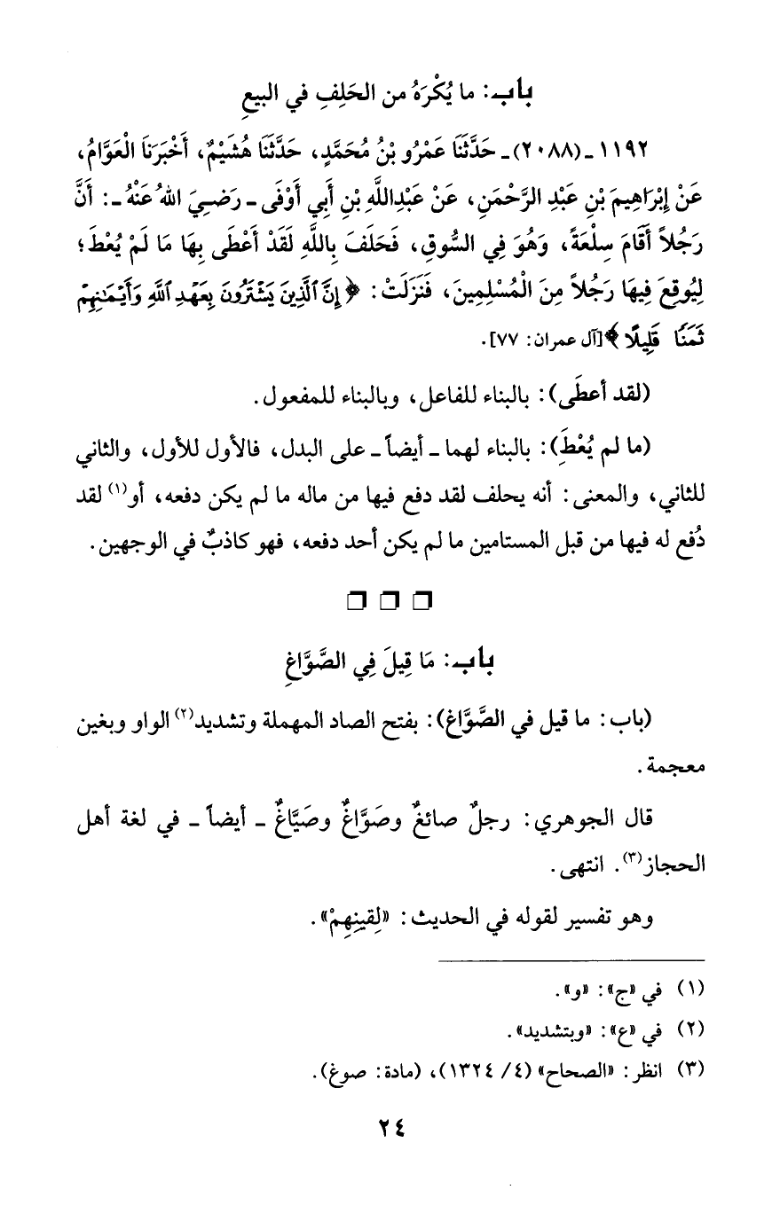 1192 - (2088) - حَدَّثَنَا عَمْرُو بْنُ مُحَمَّدٍ، حَدَّثَنَا هُشَيْمٌ، أَخْبَرَنَا الْعَوَّامُ، عَنْ إِبْرَاهِيمَ بْنِ عَبْدِ الرَّحْمَنِ، عَنْ عَبْدِ اللَّهِ بْنِ أَبي أَوْفَى - رَضِيَ اللهُ عَنْهُ -: أَنَّ رَجُلًا أَقَامَ سِلْعَةً، وَهُوَ فِي السُّوقِ، فَحَلَفَ بِاللَّهِ لَقَدْ أَعْطَى بِهَا مَا لَمْ يُعْطَ؛ لِيُوقِعَ فِيهَا رَجُلًا مِنَ الْمُسْلِمِينَ، فَنَزَلَتْ: {إِنَّ الَّذِينَ يَشْتَرُونَ بِعَهْدِ اللَّهِ وَأَيْمَانِهِمْ ثَمَنًا قَلِيلًا} [آل عمران: 77].