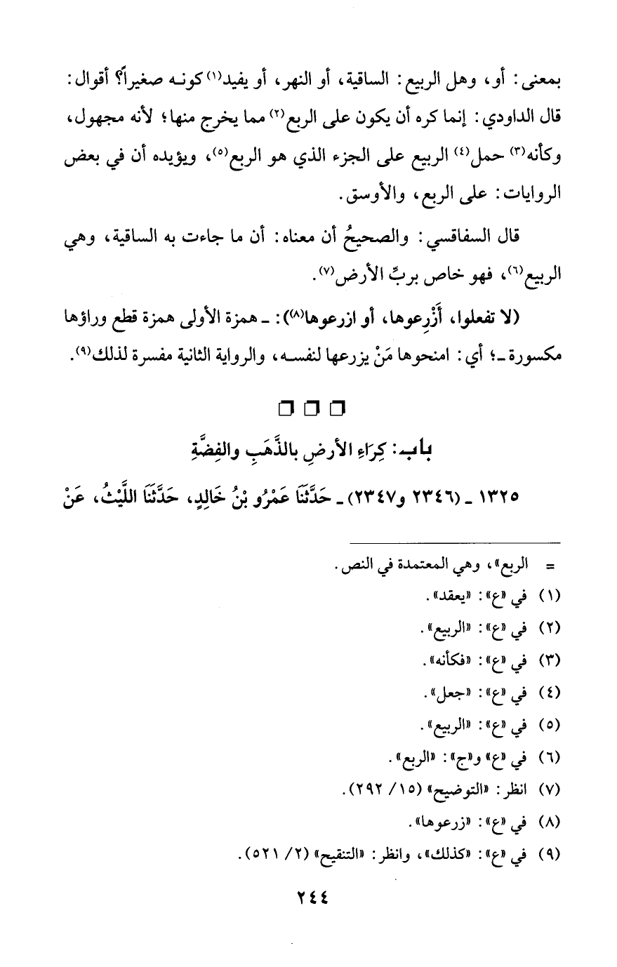 بمعنى: أو، وهل الربيع: الساقية، أو النهر، أو يفيد (¬1) كونه صغيراً؟ أقوال: قال الداودي: إنما كره أن يكون على الربع (¬2) مما يخرج منها؛ لأنه مجهول، وكأنه (¬3) حمل (¬4) الربيع على الجزء الذي هو الربع (¬5)، ويؤيده أن في بعض الروايات: على الربع، والأوسق.