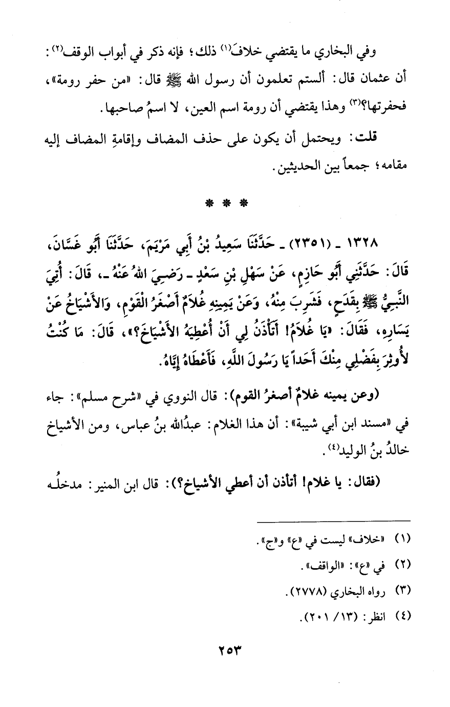 1328 - (2351) - حَدَّثَنَا سَعِيدُ بْنُ أَبِي مَرْيَمَ، حَدَّثَنَا أَبُو غَسَّانَ، قَالَ: حَدَّثَنِي أَبُو حَازِمٍ، عَنْ سَهْلِ بْنِ سَعْدٍ -رَضِيَ اللهُ عَنْهُ-، قَالَ: أُتِيَ النَّبِيُّ - صلى الله عليه وسلم - بِقَدَحٍ، فَشَرِبَ مِنْهُ، وَعَنْ يَمِينِهِ غُلاَمٌ أَصْغَرُ الْقَوْمِ، وَالأَشْيَاخُ عَنْ يَسَارِهِ، فَقَالَ: "يَا غُلاَمُ! أَتَأْذَنُ لِي أَنْ أُعْطِيَهُ الأَشْيَاخَ؟ "، قَالَ: مَا كُنْتُ لأُوثِرَ بِفَضْلِي مِنْكَ أَحَداً يَا رَسُولَ اللهِ، فَأَعْطَاهُ إِيَّاهُ.