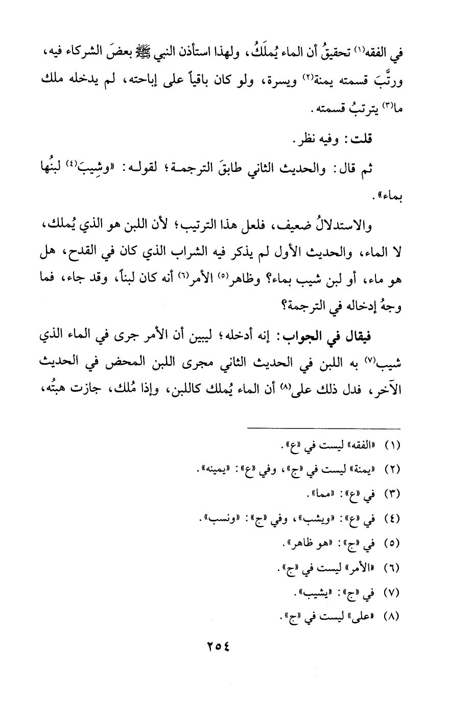 في الفقه (¬1) تحقيقُ أن الماء يُملَكُ، ولهذا استأذن النبي - صلى الله عليه وسلم - بعضَ الشركاء فيه، ورتَّبَ قسمته يمنة (¬2) ويسرة، ولو كان باقياً على إباحته، لم يدخله ملك ما (¬3) يترتبُ قسمته.