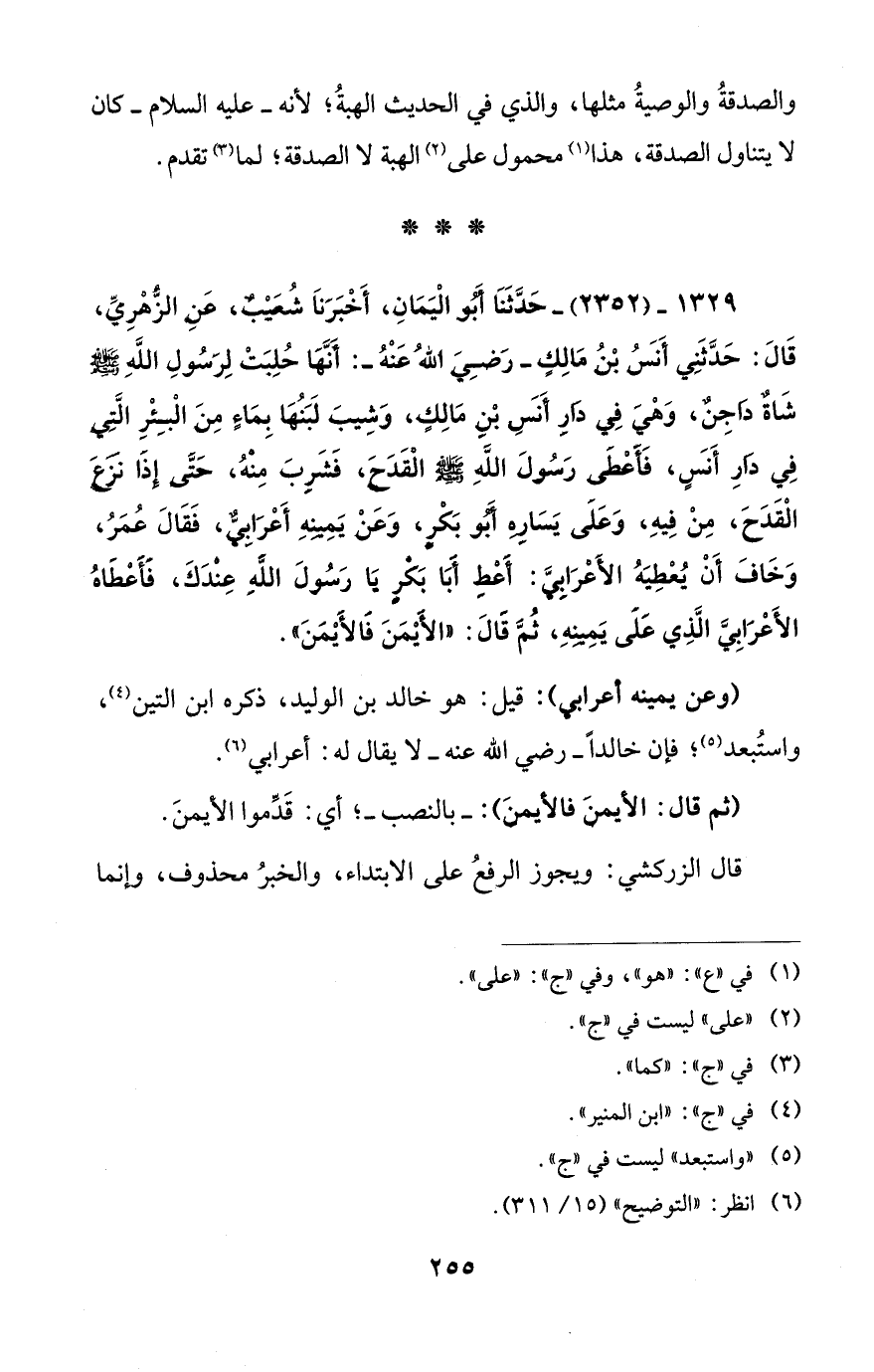 1329 - (2352) - حَدَّثَنَا أَبُو الْيَمَانِ، أَخْبَرَنَا شُعَيْبٌ، عَنِ الزُّهْرِيِّ، قَالَ: حَدَّثَنِي أَنَسُ بْنُ مَالِكٍ -رَضِيَ اللهُ عَنْهُ-: أَنَّهَا حُلِبَتْ لِرَسُولِ اللهِ - صلى الله عليه وسلم - شَاةٌ دَاجِنٌ، وَهْيَ فِي دَارِ أَنَسِ بْنِ مَالِكٍ، وَشِيبَ لَبَنُهَا بِمَاءٍ مِنَ الْبِئْرِ الَّتِي فِي دَارِ أَنَسٍ، فَأَعْطَى رَسُولَ اللهِ - صلى الله عليه وسلم - الْقَدَحَ، فَشَرِبَ مِنْهُ، حَتَّى إِذَا نَزَعَ الْقَدَحَ، مِنْ فِيهِ، وَعَلَى يَسَارِهِ أَبُو بَكْرٍ، وَعَنْ يَمِينِهِ أَعْرَابيٌّ، فَقَالَ عُمَرُ، وَخَافَ أَنْ يُعْطِيَهُ الأَعْرَابِيَّ: أَعْطِ أَبَا بَكْرٍ يَا رَسُولَ اللهِ عِنْدَكَ، فَأَعْطَاهُ الأَعْرَابِيَّ الَّذِي عَلَى يَمِينِهِ، ثُمَّ قَالَ: "الأَيْمَنَ فَالأَيْمَنَ".