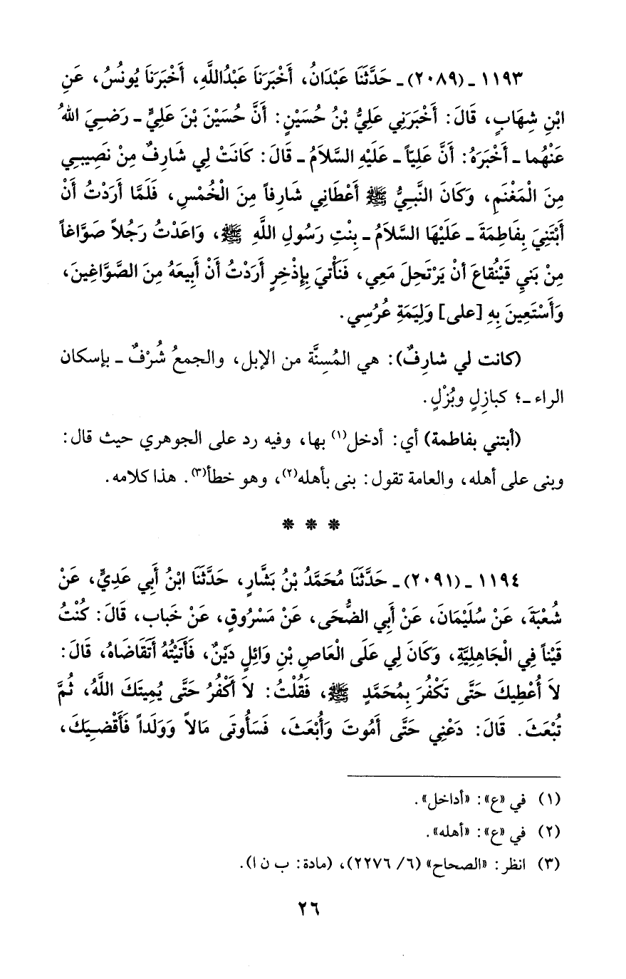 1193 - (2089) - حَدَّثَنَا عَبْدَانُ، أَخْبَرَنَا عَبْدُ اللَّهِ، أَخْبَرَنَا يُونُسُ، عَنِ ابْنِ شِهَابٍ، قَالَ: أَخْبَرَنِي عَلِيُّ بْنُ حُسَيْنٍ: أَنَّ حُسَيْنَ بْنَ عَلِيٍّ - رَضِيَ اللهُ عَنْهُما - أَخْبَرَهُ: أَنَّ عَلِيًّا - عَلَيْهِ السَّلاَمُ - قَالَ: كَانَتْ لِي شَارِفٌ مِنْ نصَيبِي مِنَ الْمَغْنَمِ، وَكَانَ النَّبِيُّ - صلى الله عليه وسلم - أَعْطَانِي شَارِفًا مِنَ الْخُمْسِ، فَلَمَّا أَرَدْتُ أَنْ أَبْتَنِيَ بِفَاطِمَةَ - عَلَيْهَا السَّلاَمُ - بِنْتِ رَسُولِ اللَّهِ - صلى الله عليه وسلم -، وَاعَدْتُ رَجُلًا صَوَّاغًا مِنْ بَنيِ قَيْنُقاعَ أنْ يَرْتَحِلَ مَعِي، فَنَأْتيَ بِإِذْخِرٍ أَرَدْتُ أَنْ أَبِيعَهُ مِنَ الصَّوَّاغِينَ، وَأَسْتَعِينَ بِهِ [على] وَلِيَمَةِ عُرُسِي.