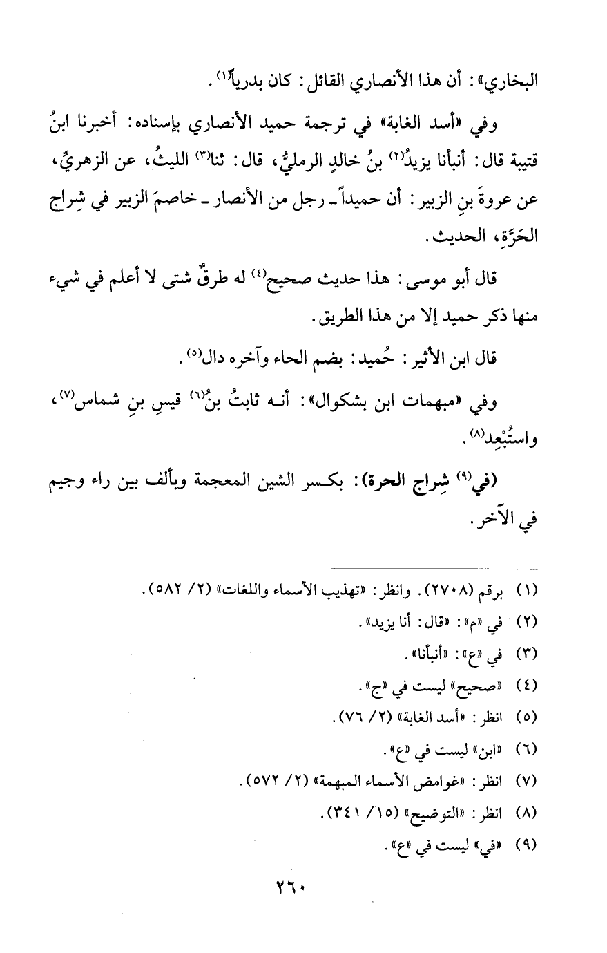 وفي "أسد الغابة" في ترجمة حميد الأنصاري بإسناده: أخبرنا ابنُ قتيبة قال: أنبأنا يزيدُ (¬2) بنُ خالدٍ الرمليُّ، قال: ثنا (¬3) الليثُ، عن الزهريِّ، عن عروةَ بنِ الزبير: أن حميداً -رجل من الأنصار- خاصمَ الزبير في شِراج الحَرَّةِ، الحديث.