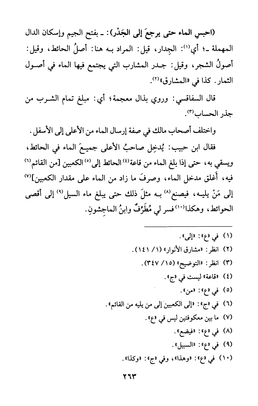 فقال ابن حبيب: يُدخِل صاحبُ الأعلى جميعَ الماء في الحائط، ويسقي به، حتى إذا بلغ الماء من قاعة (¬4) الحائط إلى (¬5) الكعبين [من القائم (¬6) فيه، أَغلق مدخل الماء، وصرفَ ما زاد من الماء على مقدار الكعبين] (¬7) إلى مَنْ يليه، فيصنع (¬8) به مثلَ ذلك حتى يبلغ ماء السيل (¬9) إلى أقصى الحوائط، وهكذا (¬10) فسر لي مُطَرِّفٌ وابنُ الماجِشونِ.