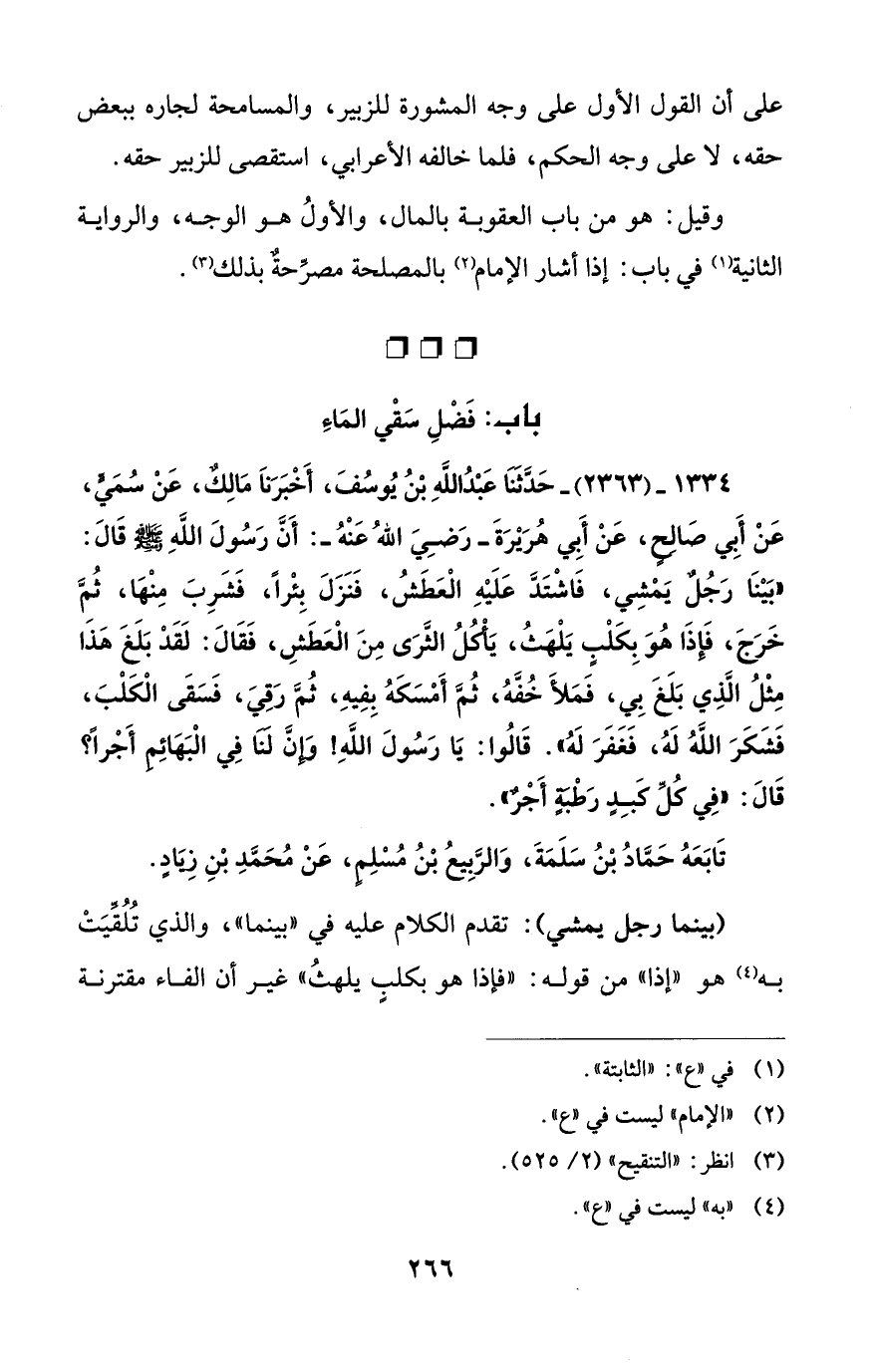 1334 - (2363) - حَدَّثَنَا عَبْدُ اللهِ بْنُ يُوسُفَ، أَخْبَرَنَا مَالِكٌ، عَنْ سُمَيًّ، عَنْ أَبِي صَالِحٍ، عَنْ أَبِي هُرَيْرَةَ -رَضِيَ اللهُ عَنْهُ-: أَنَّ رَسُولَ اللهِ - صلى الله عليه وسلم - قَالَ: "بَيْنَا رَجُلٌ يَمْشِي، فَاشْتَدَّ عَلَيْهِ الْعَطَشُ، فَنَزَلَ بِئْراً، فَشَرِبَ مِنْهَا، ثُمَّ خَرَجَ، فَإذَا هُوَ بِكَلْبٍ يَلْهَثُ، يَأْكُلُ الثَّرَى مِنَ الْعَطَشِ، فَقَالَ: لَقَدْ بَلَغَ هَذَا مِثْلُ الَّذِي بَلَغَ بِي، فَمَلأَ خُفَّهُ، ثُمَّ أَمْسَكَهُ بِفِيهِ، ثُمَّ رَقِيَ، فَسَقَى الْكَلْبَ، فَشَكَرَ اللهُ لَهُ، فَغَفَرَ لَهُ". قَالُوا: يَا رَسُولَ اللهِ! وَإنَّ لَنَا فِي الْبَهَائِمِ أَجْراً؟ قَالَ: "فِي كُلِّ كَبِدٍ رَطْبَةٍ أَجْرٌ".