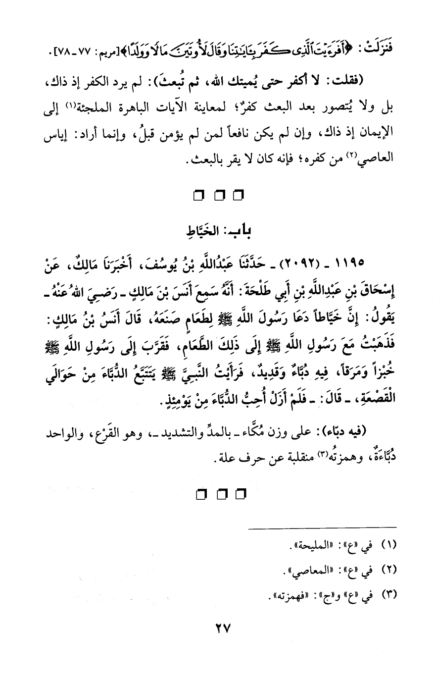 1195 - (2092) - حَدَّثَنَا عَبْدُ اللَّهِ بْنُ يُوسُفَ، أَخْبَرَنَا مَالِكٌ، عَنْ إِسْحَاقَ بْنِ عَبْدِ اللَّهِ بْنِ أَبي طَلْحَةَ: أنَهُ سَمِعَ أَنَسَ بْنَ مَالِكٍ - رَضِيَ اللهُ عَنْهُ - يَقُولُ: إِنَّ خَيَّاطًا دَعَا رَسُولَ اللَّهِ - صلى الله عليه وسلم - لِطَعَامٍ صَنَعَهُ، قَالَ أَنَسُ بْنُ مَالِكٍ: فَذَهَبْتُ مَعَ رَسُولِ اللَّهِ - صلى الله عليه وسلم - إِلَى ذَلِكَ الطعَامِ، فَقَرَّبَ إِلَى رَسُولِ اللَّهِ - صلى الله عليه وسلم - خُبْزًا وَمَرَقًا، فِيهِ دُبَّاءٌ وَقَدِيدٌ، فَرَأَيْتُ النَّبِيَّ - صلى الله عليه وسلم - يَتَتَبَّعُ الدُّبَّاءَ مِنْ حَوَالَي الْقَصْعَةِ، - قَالَ: - فَلَمْ أَزَلْ أُحِبُّ الدُّبَّاءَ مِنْ يَوْمِئِذٍ.