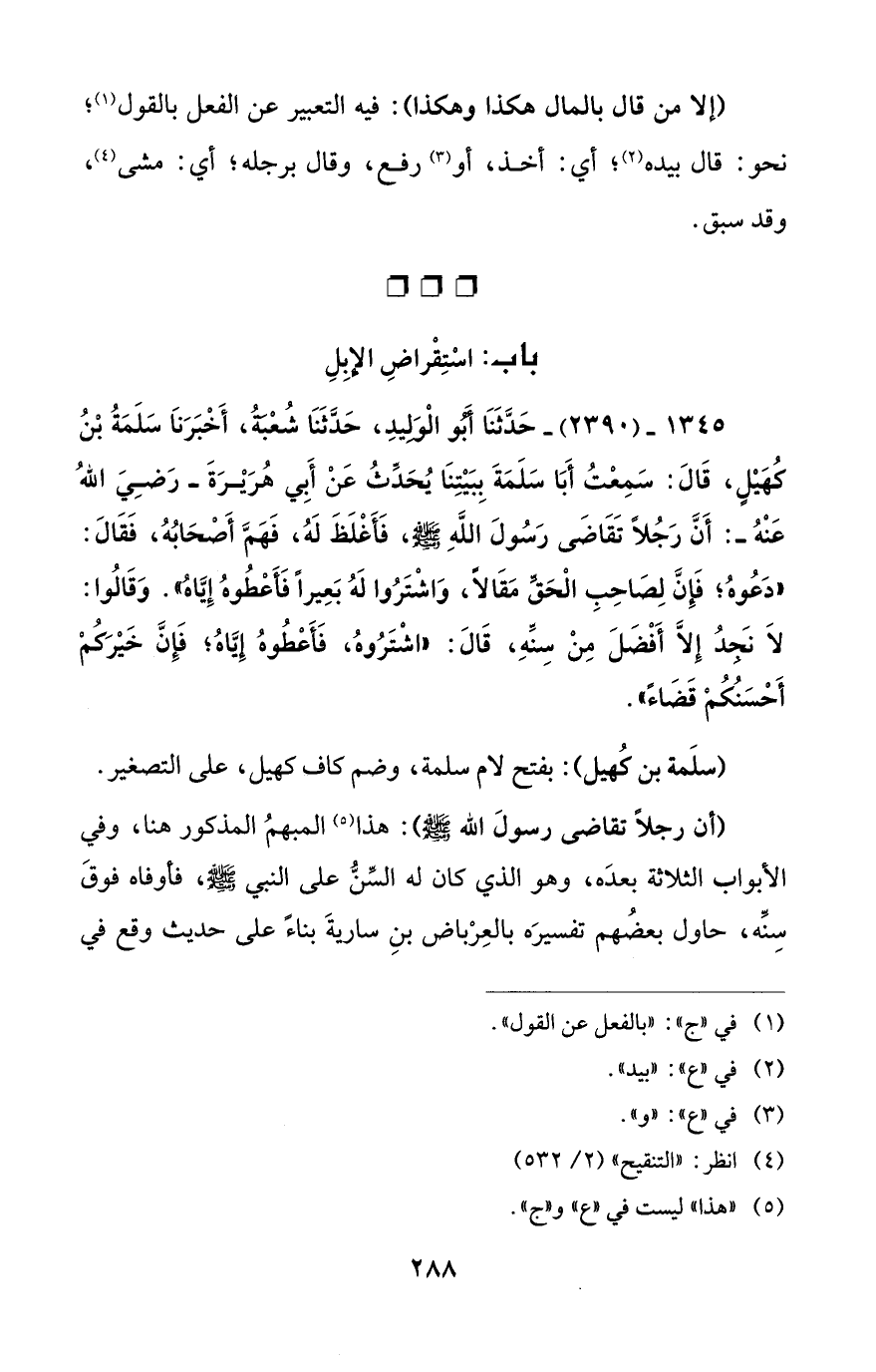 1345 - (2390) - حَدَّثَنَا أَبُو الْوَلِيدِ، حَدَّثَنَا شُعْبَةُ، أَخْبَرَنَا سَلَمَةُ بْنُ كُهَيْلٍ، قَالَ: سَمِعْتُ أَبَا سَلَمَةَ بِبَيْتِنَا يُحَدِّثُ عَنْ أَبِي هُرَيْرَةَ -رَضِيَ اللهُ عَنْهُ-: أَنَّ رَجُلاً تَقَاضَى رَسُولَ اللهِ - صلى الله عليه وسلم -، فَأَغْلَظَ لَهُ، فَهَمَّ أَصْحَابُهُ، فَقَالَ: "دَعُوهُ؛ فَإِنَّ لِصَاحِبِ الْحَقِّ مَقَالاً، وَاشْتَرُوا لَهُ بَعِيراً فَأَعْطُوهُ إِيَّاهُ". وَقَالُوا: لاَ نَجِدُ إِلاَّ أَفْضَلَ مِنْ سِنِّهِ، قَالَ: "اشْتَرُوهُ، فَأَعْطُوهُ إِيَّاهُ؛ فَإِنَّ خَيْرَكُمْ أَحْسَنُكُمْ قَضَاءً".
