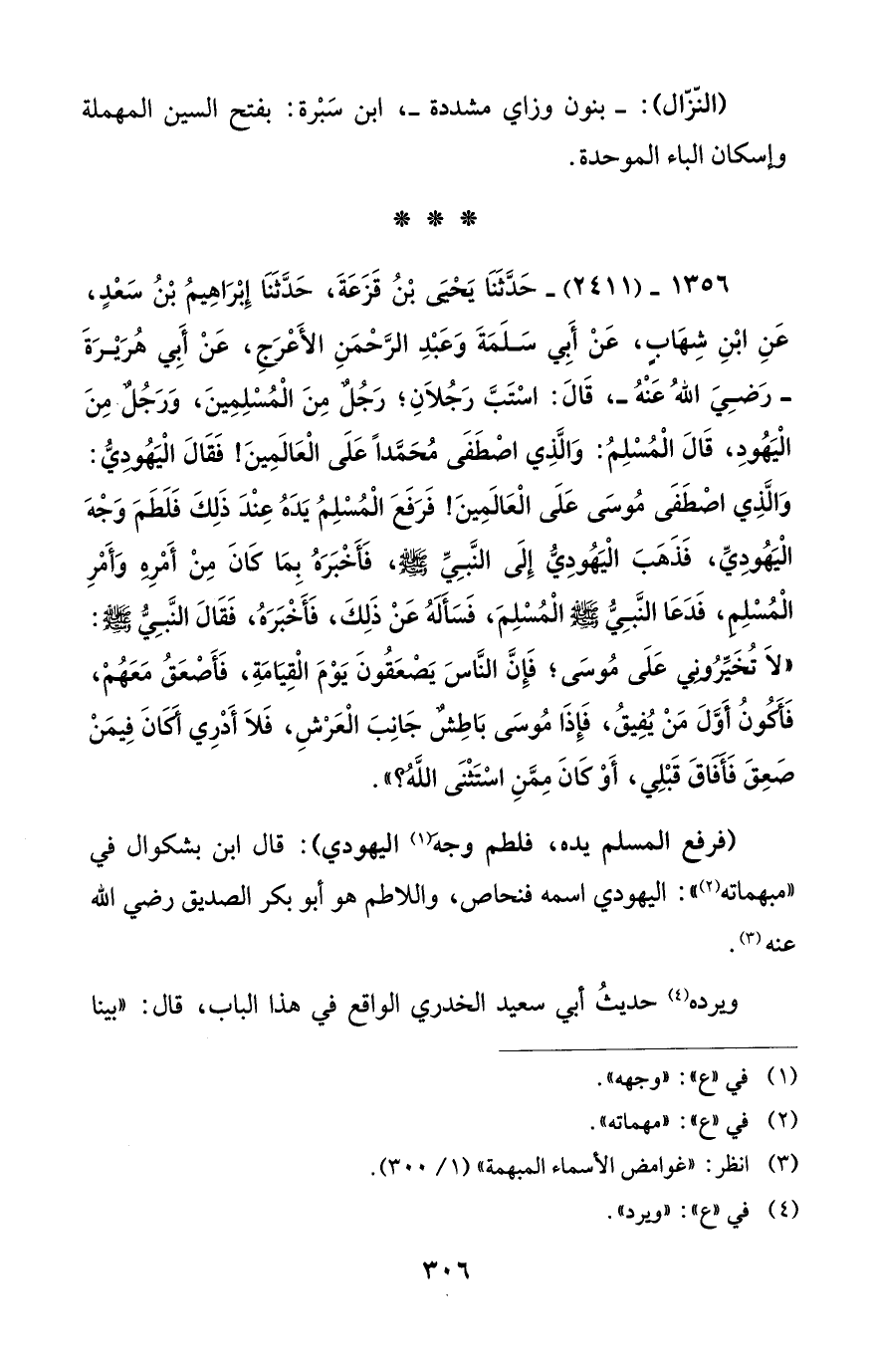 1356 - (2411) - حَدَّثَنَا يَحْيَى بْنُ قَزَعَةَ، حَدَّثَنَا إِبْرَاهِيمُ بْنُ سَعْدٍ، عَنِ ابْنِ شِهَابٍ، عَنْ أَبِي سَلَمَةَ وَعَبْدِ الرَّحْمَنِ الأَعْرَجِ، عَنْ أَبِي هُرَيْرَةَ -رَضِيَ اللهُ عَنْهُ-، قَالَ: اسْتَبَّ رَجُلاَنِ؛ رَجُلٌ مِنَ الْمُسْلِمِينَ، وَرَجُلٌ مِنَ الْيَهُودِ، قَالَ الْمُسْلِمُ: وَالَّذِي اصْطَفَى مُحَمَّداً عَلَى الْعَالَمِينَ! فَقَالَ الْيَهُودِيُّ: وَالَّذِي اصْطَفَى مُوسَى عَلَى الْعَالَمِينَ! فَرَفَعَ الْمُسْلِمُ يَدَهُ عِنْدَ ذَلِكَ فَلَطَمَ وَجْهَ الْيَهُودِيِّ، فَذَهَبَ الْيَهُودِيُّ إِلَى النَّبِيِّ - صلى الله عليه وسلم -، فَأَخْبَرَهُ بِمَا كَانَ مِنْ أَمْرِهِ وَأَمْرِ الْمُسْلِم، فَدَعَا النَّبِيُّ - صلى الله عليه وسلم - الْمُسْلِمَ، فَسَأَلَهُ عَنْ ذَلِكَ، فَأَخْبَرَهُ، فَقَالَ النَّبِيُّ - صلى الله عليه وسلم -: "لاَ تُخَيِّرُونِي عَلَى مُوسَى؛ فَإِنَّ النَّاسَ يَصْعَقُونَ يَوْمَ الْقِيَامَةِ، فَأَصْعَقُ مَعَهُمْ، فَأَكُونُ أَوَّلَ مَنْ يُفِيقُ، فَإِذَا مُوسَى بَاطِشٌ جَانِبَ الْعَرْشِ، فَلاَ أَدْرِي أَكَانَ فِيمَنْ صَعِقَ فَأَفَاقَ قَبْلِي، أَوْ كَانَ مِمَّنِ اسْتَثْنَى اللهُ؟ ".