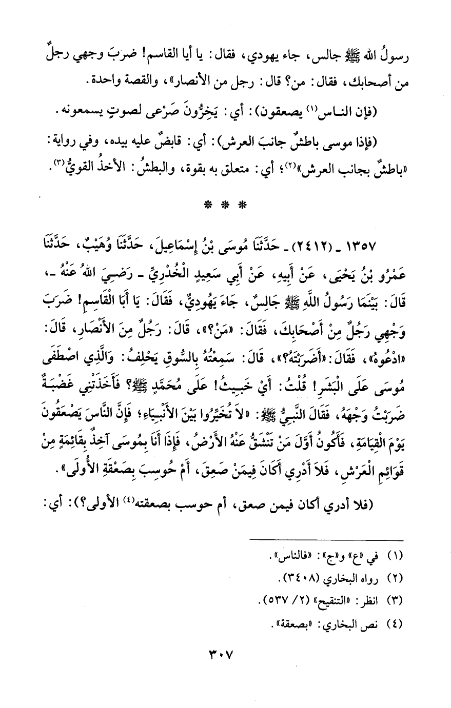 1357 - (2412) - حَدَّثَنَا مُوسَى بْنُ إِسْمَاعِيلَ، حَدَّثَنَا وُهَيْبٌ، حَدَّثَنَا عَمْرُو بْنُ يَحْيَى، عَنْ أَبِيهِ، عَنْ أَبِي سَعِيدٍ الْخُدْرِيِّ -رَضِيَ اللهُ عَنْهُ-، قَالَ: بَيْنَمَا رَسُولُ اللهِ - صلى الله عليه وسلم - جَالِسٌ، جَاءَ يَهُودِيٌّ، فَقَالَ: يَا أَبَا الْقَاسِم! ضَرَبَ وَجْهِي رَجُلٌ مِنْ أَصْحَابِكَ، فَقَالَ: "مَنْ؟ "، قَالَ: رَجُلٌ مِنَ الأَنْصَارِ، قَالَ: "ادْعُوهُ"، فَقَالَ: "أَضَرَبْتَهُ؟ "، قَالَ: سَمِعْتُهُ بِالسُّوقِ يَحْلِفُ: وَالَّذِي اصْطَفَى مُوسَى عَلَى الْبَشَرِ! قُلْتُ: أَيْ خَبِيثُ! عَلَى مُحَمَّدٍ - صلى الله عليه وسلم -؟ فَأَخَذَتْنِي غَضْبَةٌ ضَرَبْتُ وَجْهَهُ، فَقَالَ النَّبِيُّ - صلى الله عليه وسلم -: "لاَ تُخَيِّرُوا بَيْنَ الأَنْبِيَاءِ؛ فَإِنَّ النَّاسَ يَصْعَقُونَ يَوْمَ الْقِيَامَةِ، فَأَكُونُ أَوَّلَ مَنْ تَنْشَقُّ عَنْهُ الأَرْضُ، فَإِذَا أَنَا بِمُوسَى آخِذٌ بِقَائِمَةٍ مِنْ قَوَائِم الْعَرْشِ، فَلاَ أَدْرِي أَكَانَ فِيمَنْ صَعِقَ، أَمْ حُوسِبَ بِصَعْقَةِ الأُولَى".