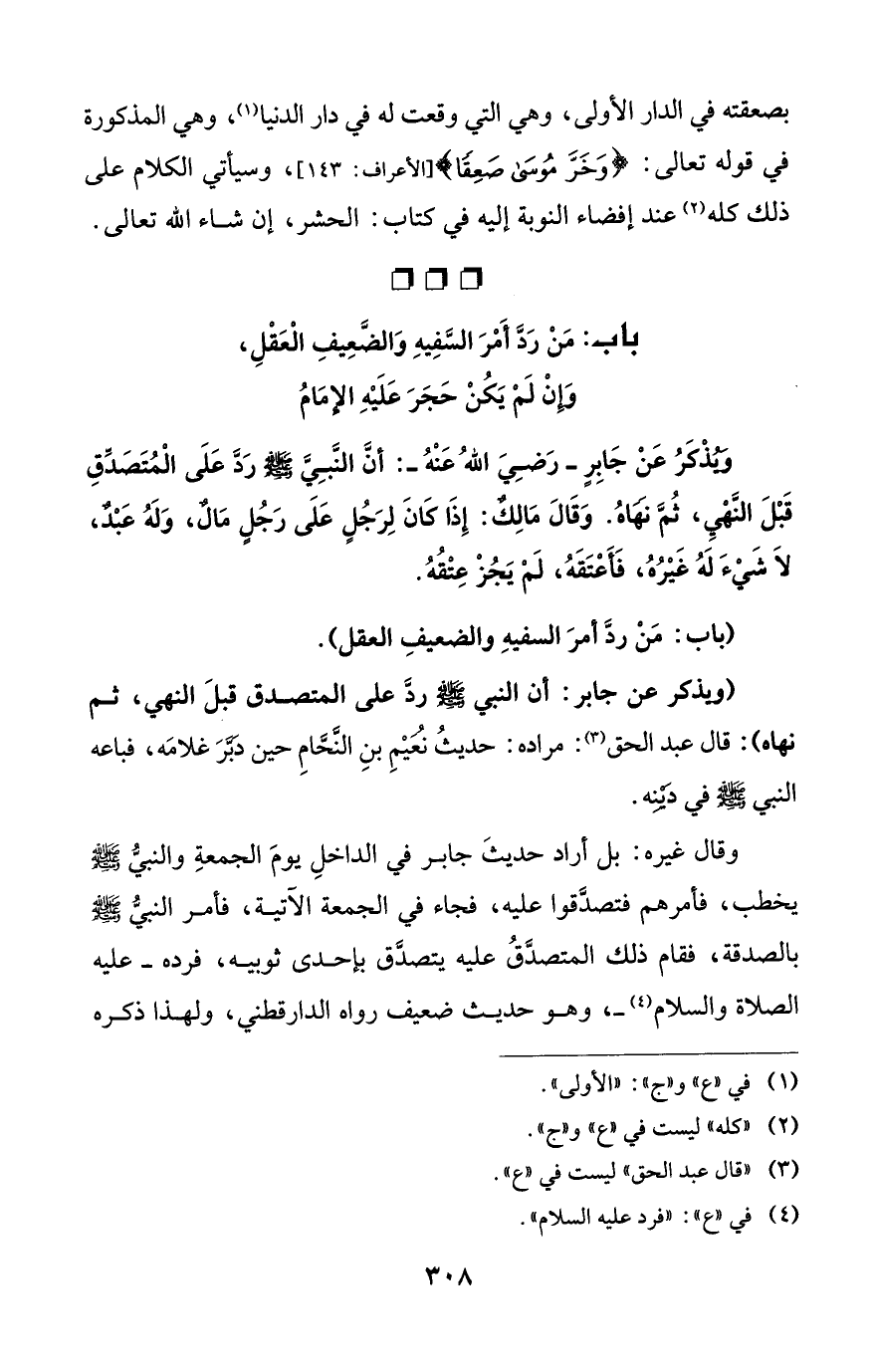 (ويذكر عن جابر: أن النبي - صلى الله عليه وسلم - ردَّ على المتصدق قبلَ النهي، ثم نهاه): قال عبد الحق (¬3): مراده: حديثُ نُعَيْمِ بنِ النَّحَّامِ حين دَبَّرَ غلامَه، فباعه النبي - صلى الله عليه وسلم - في دَيْنِه.