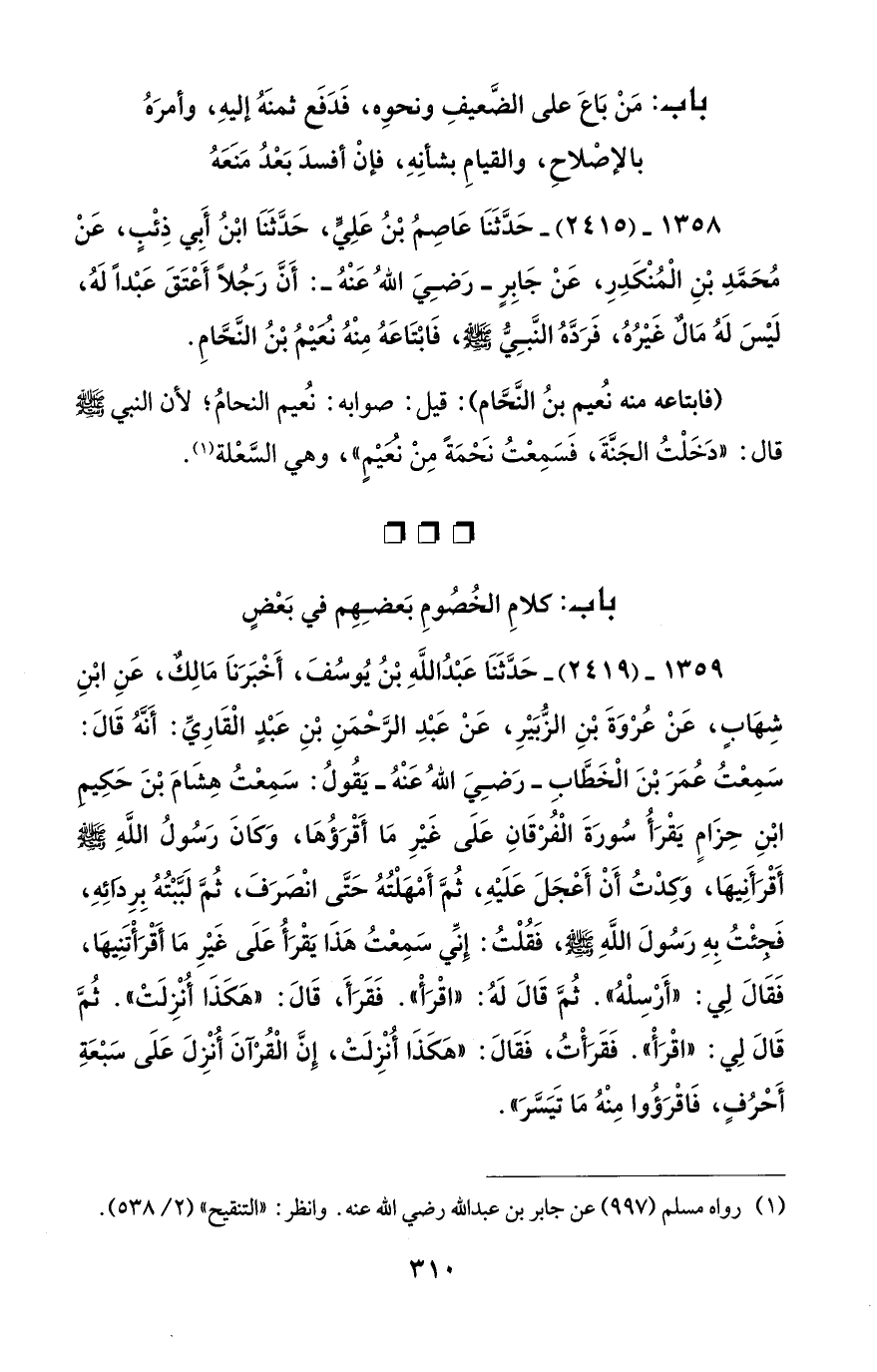 1358 - (2415) - حَدَّثَنَا عَاصِمُ بْنُ عَلِيٍّ، حَدَّثَنَا ابْنُ أَبي ذِئْبٍ، عَنْ مُحَمَّدِ بْنِ الْمُنْكَدِرِ، عَنْ جَابِرٍ -رَضِيَ اللهُ عَنْهُ-: أَنَّ رَجُلاً أَعْتَقَ عَبْداً لَهُ، لَيْسَ لَهُ مَالٌ غَيْرُهُ، فَرَدَّهُ النَّبِيُّ - صلى الله عليه وسلم -، فَابْتَاعَهُ مِنْهُ نُعَيْمُ بْنُ النَّحَّامِ.