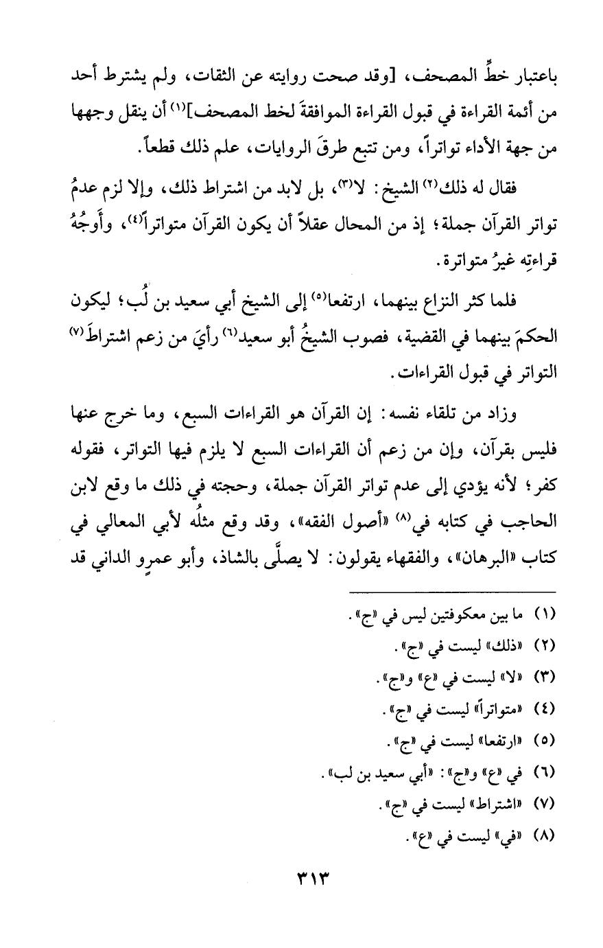 فقال له ذلك (¬2) الشيخ: لا (¬3)، بل لا بد من اشتراط ذلك، وإلا لزم عدمُ تواتر القرآن جملة؛ إذ من المحال عقلاً أن يكون القرآن متواتراً (¬4)، وأَوجُهُ قراءتِه غيرُ متواترة.