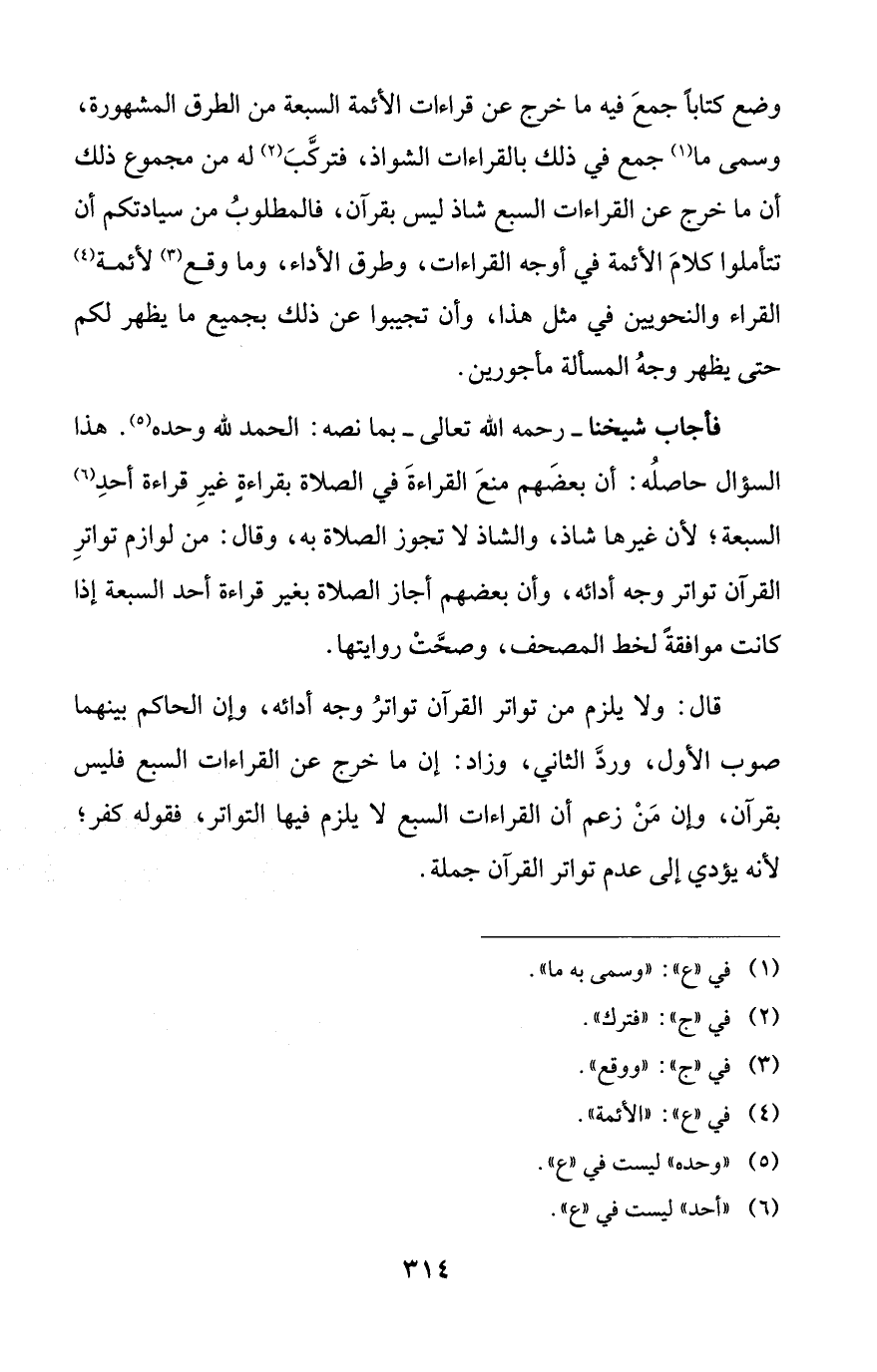 فأجاب شيخنا -رحمه الله تعالى- بما نصه: الحمد لله وحده (¬5). هذا السؤال حاصلُه: أن بعضَهم منعَ القراءةَ في الصلاة بقراءةٍ غيرِ قراءة أحدِ (¬6) السبعة؛ لأن غيرها شاذ، والشاذ لا تجوز الصلاة به، وقال: من لوازم تواترِ القرآن تواتر وجه أدائه، وأن بعضهم أجاز الصلاة بغير قراءة أحد السبعة إذا كانت موافقةً لخط المصحف، وصحَّتْ روايتها.