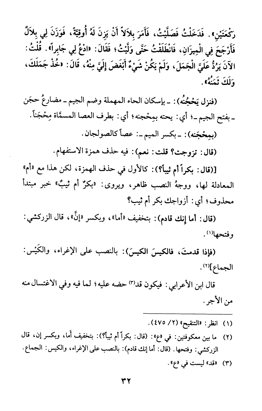 [(قال: بكراً أم ثيبًا؟): كالأول في حذف الهمزة، لكن هذا مع "أم" المعادلة لها، ووجهُ النصب ظاهر، ويروى: "بكرٌ أم ثيثٌ" خبر مبتدأ محذوف؛ أي: أزواجك بكر أم ثيب؟