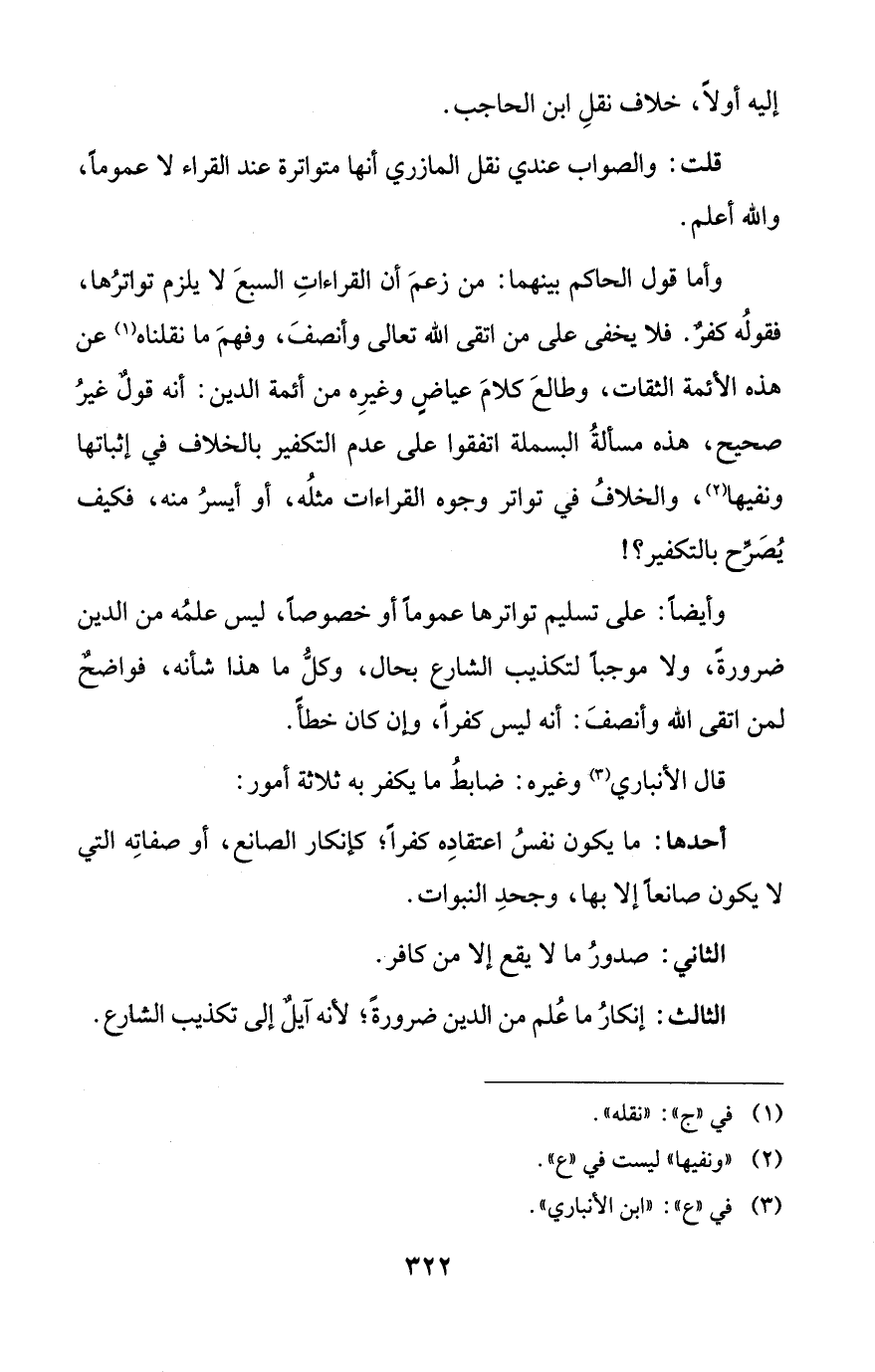 وأما قول الحاكم بينهما: من زعمَ أن القراءاتِ السبعَ لا يلزم تواترُها، فقولُه كفرٌ. فلا يخفى على من اتقى الله تعالى وأنصفَ، وفهمَ ما نقلناه (¬1) عن هذه الأئمة الثقات، وطالعَ كلامَ عياضٍ وغيرِه من أئمة الدين: أنه قولٌ غيرُ صحيح، هذه مسألةُ البسملة اتفقوا على عدم التكفير بالخلاف في إثباتها ونفيها (¬2)، والخلافُ في تواتر وجوه القراءات مثلُه، أو أيسرُ منه، فكيف يُصَرَّح بالتكفير؟!