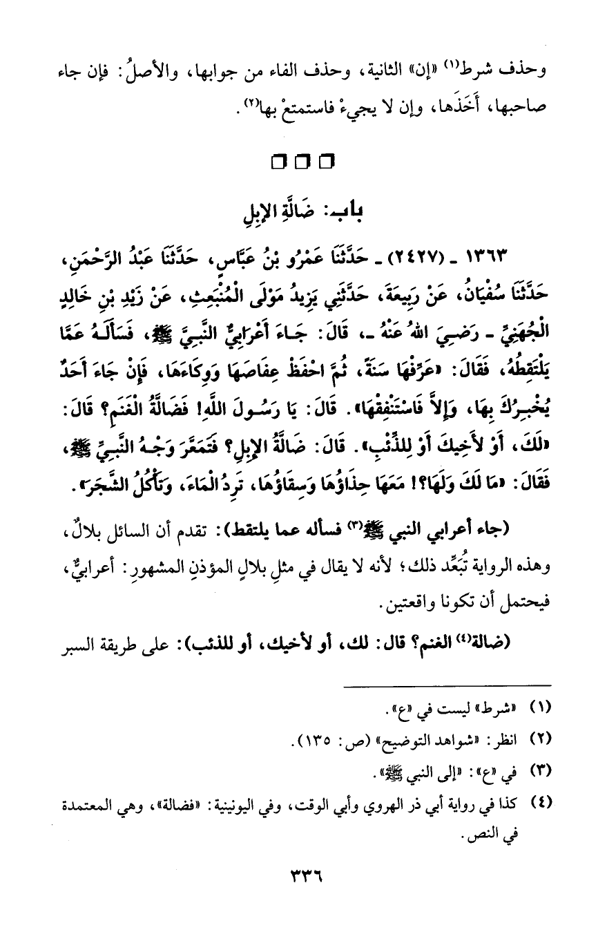 1363 - (2427) - حَدَّثَنَا عَمْرُو بْنُ عَبَّاسٍ، حَدَّثَنَا عَبْدُ الرَّحْمَنِ، حَدَّثَنَا سُفْيَانُ، عَن رَبِيعَةَ، حَدَّثَنِي يَزِيدُ مَوْلَى الْمُنْبَعِثِ، عَنْ زيدِ بْنِ خَالِدٍ الْجُهَنِيِّ -رَضِيَ اللهُ عَنْهُ-، قَالَ: جَاءَ أَعْرَابِيٌّ النَّبِيَّ - صلى الله عليه وسلم -، فَسَأَلَهُ عَمَّا يَلْتَقِطُهُ، فَقَالَ: "عَرَّفْهَا سَنَةً، ثُمَّ احْفَظْ عِفَاصَهَا وَوِكَاءَهَا، فَإِنْ جَاءَ أَحَدٌ يُخْبِرُكَ بِهَا، وَإِلاَّ فَاسْتَنْفِقْهَا". قَالَ: يَا رَسُولَ اللهِ! فَضَالَّةُ الْغَنَمِ؟ قَالَ: "لَكَ، أَوْ لأَخِيكَ أَوْ لِلذِّئْبِ". قَالَ: ضَالَّةُ الإِبِلِ؟ فَتَمَعَّرَ وَجْهُ النَّبِيِّ - صلى الله عليه وسلم - فَقَالَ: "مَا لَكَ وَلَهَا؟! مَعَهَا حِذَاؤُهَا وَسِقَاؤُهَا، تَرِدُ الْمَاءَ، وَتَأْكُلُ الشَّجَرَ".