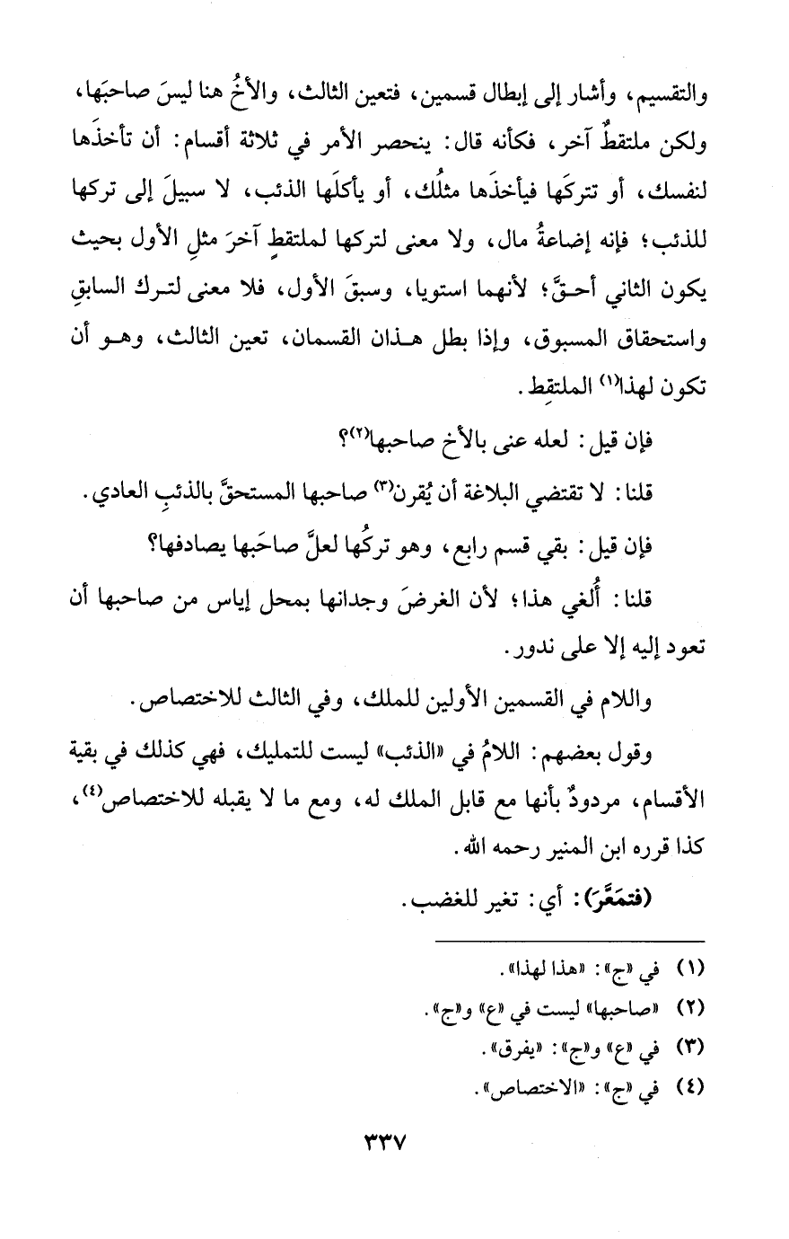 والتقسيم، وأشار إلى إبطال قسمين، فتعين الثالث، والأخُ هنا ليسَ صاحبَها، ولكن ملتقطٌ آخر، فكأنه قال: ينحصر الأمر في ثلاثة أقسام: أن تأخذَها لنفسك، أو تتركَها فيأخذَها مثلُك، أو يأكلَها الذئب، لا سبيلَ إلى تركها للذئب؛ فإنه إضاعةُ مال، ولا معنى لتركها لملتقطٍ آخرَ مثلِ الأول بحيث يكون الثاني أحقَّ؛ لأنهما استويا، وسبقَ الأول، فلا معنى لترك السابقِ واستحقاق المسبوق، وإذا بطل هذان القسمان، تعين الثالث، وهو أن تكون لهذا (¬1) الملتقِط.