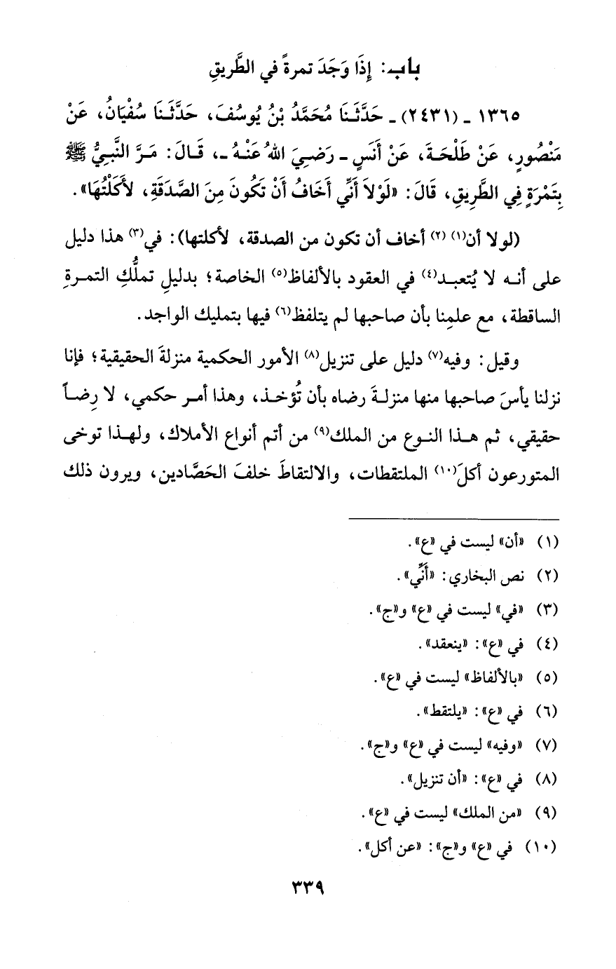 1365 - (2431) - حَدَّثَنَا مُحَمَّدُ بْنُ يُوسُفَ، حَدَّثَنَا سُفْيَانُ، عَنْ مَنْصُورٍ، عَنْ طَلْحَةَ، عَنْ أَنَسٍ -رَضِيَ اللهُ عَنْهُ-، قَالَ: مَرَّ النَّبِيُّ - صلى الله عليه وسلم - بِتَمْرَةٍ فِي الطَّرِيقِ، قَالَ: "لَوْلاَ أَنِّي أَخَافُ أَنْ تَكُونَ مِنَ الصَّدَقَةِ، لأَكَلْتُهَا".
