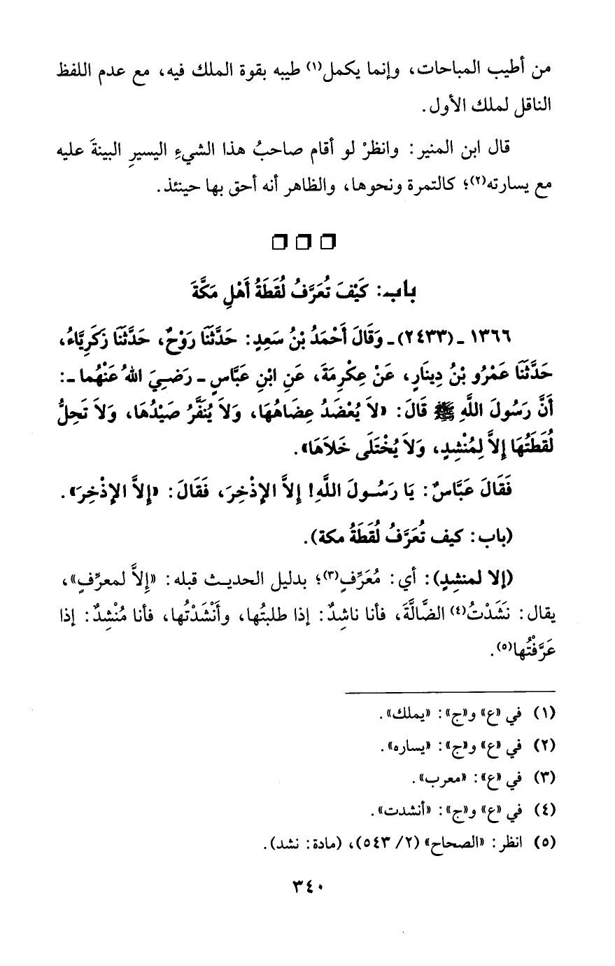 1366 - (2433) - وَقَالَ أَحْمَدُ بْنُ سَعِدٍ: حَدَّثَنَا رَوْحٌ، حَدَّثَنَا زَكَرِيَّاءُ، حَدَّثَنَا عَمْرُو بْنُ دِينَارٍ، عَنْ عِكْرِمَةَ، عَنِ ابْنِ عَبَّاسٍ -رَضِيَ اللهُ عَنْهُما-: أَنَّ رَسُولَ اللهِ - صلى الله عليه وسلم - قَالَ: "لاَ يُعْضَدُ عِضَاهُهَا، وَلاَ يُنَفَّرُ صَيْدُهَا، وَلاَ تَحِلُّ لُقَطَتُهَا إِلاَّ لِمُنْشِدٍ، وَلاَ يُخْتَلَى خَلاَهَا".