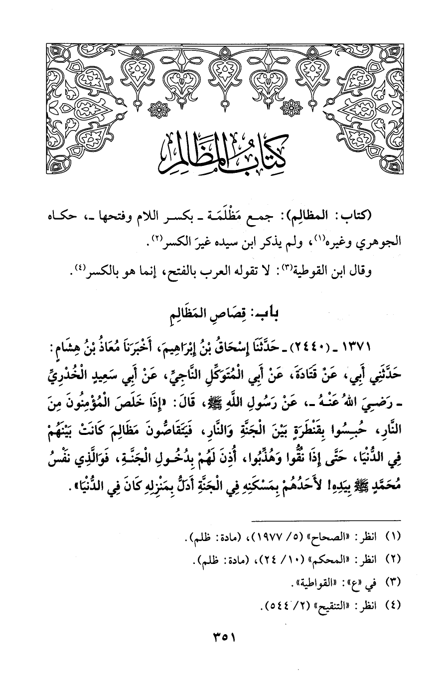 1371 - (2440) - حَدَّثَنَا إِسْحَاقُ بْنُ إِبْرَاهِيمَ، أَخْبَرَناَ مُعَاذُ بْنُ هِشَامٍ: حَدَّثَنِي أَبِي، عَنْ قَتَادَةَ، عَنْ أَبِي الْمُتَوَكِّلِ النَّاجِيِّ، عَنْ أَبِي سَعِيدٍ الْخُدْرِيِّ -رَضِيَ اللهُ عَنْهُ-، عَنْ رَسُولِ اللهِ - صلى الله عليه وسلم -، قَالَ: "إِذَا خَلَصَ المُؤْمِنُونَ مِنَ النَّارِ، حُبِسُوا بِقَنْطَرَةٍ بَيْن الْجَنَّةِ وَالنَّارِ، فَيَتَقَاصُّونَ مَظَالِمَ كَانَتْ بَيْنَهُمْ فِي الدُّنْيَا، حَتَّى إِذَا نُقُّوا وَهُذِّبُوا، أُذِنَ لَهُمْ بِدخُولِ الْجَنَّةِ، فَوَالَّذِي نَفْسُ مُحَمَّدٍ - صلى الله عليه وسلم - بِيَدِهِ! لأَحَدُهُمْ بِمَسْكَنِهِ فِي الْجَنَّةِ أَدَلُّ بِمَنْزِلهِ كَانَ فِي الدُّنْيَا".
