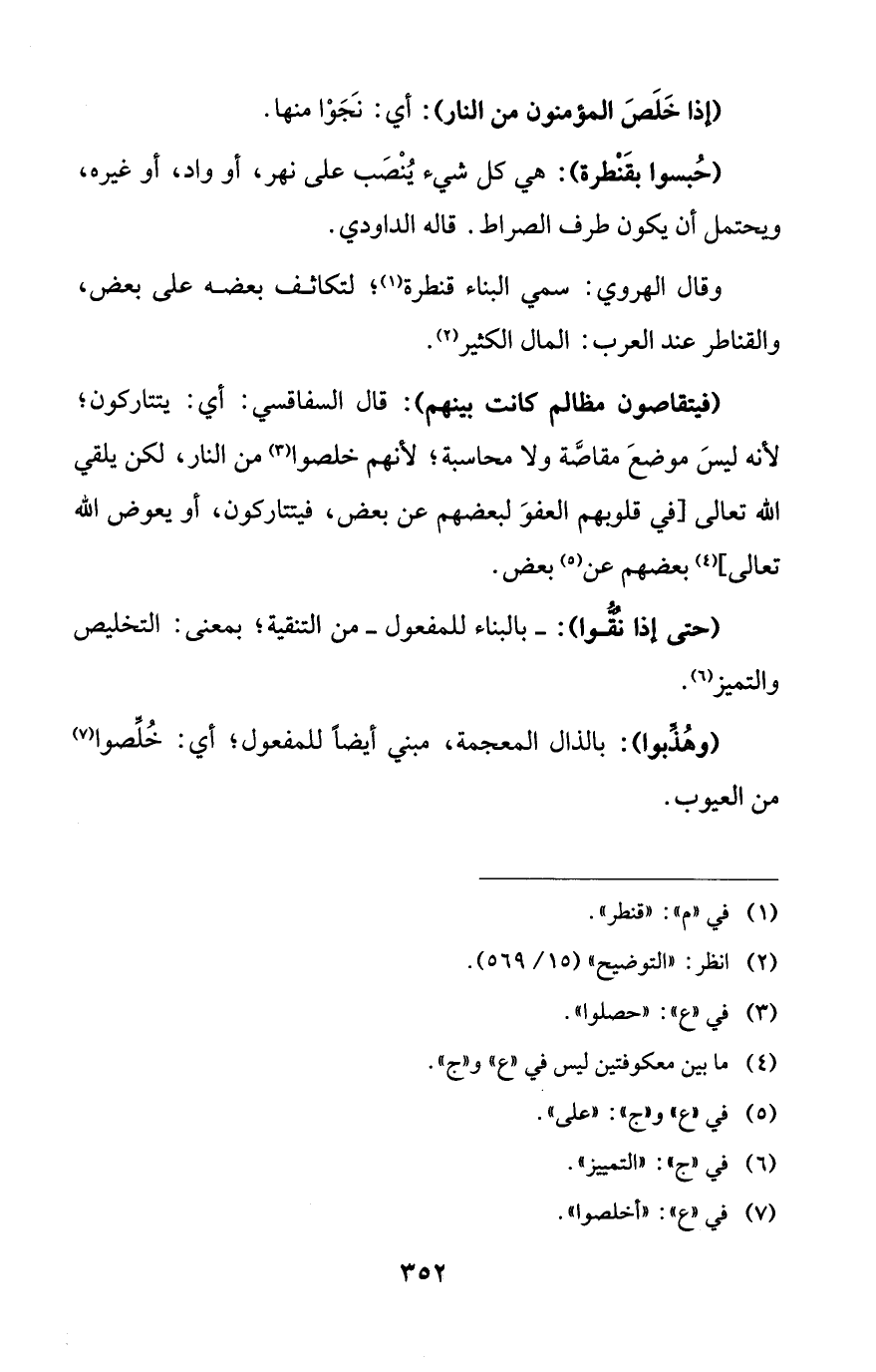 (حُبسوا بقَنْطرة): هي كل شيء يُنْصَب على نهر، أو واد، أو غيره، ويحتمل أن يكون طرف الصراط. قاله الداودي.