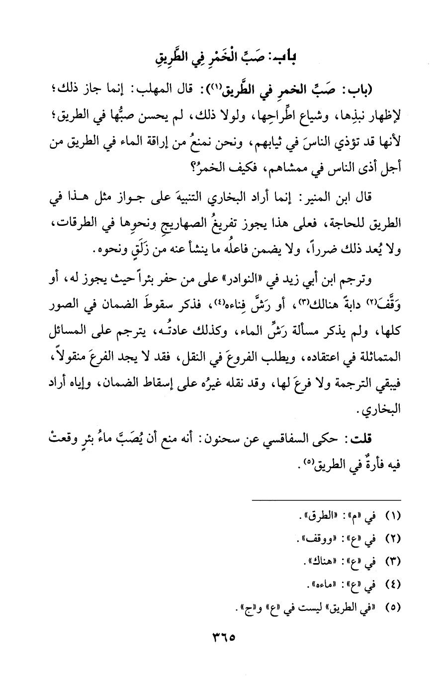 قال ابن المنير: إنما أراد البخاري التنبيهَ على جواز مثل هذا في الطريق للحاجة، فعلى هذا يجوز تفريغُ الصهاريجِ ونحوِها في الطرقات، ولا يُعد ذلك ضرراً، ولا يضمن فاعلُه ما ينشأ عنه من زَلَقٍ ونحوه.