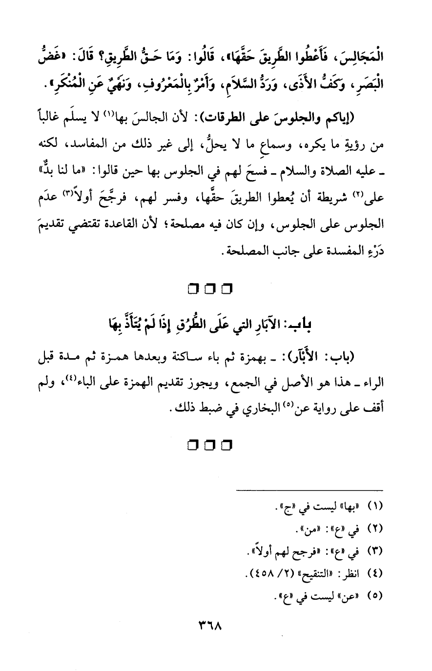 الْمَجَالِسَ، فَأَعْطُوا الطَّرِيقَ حَقَّهَا"، قَالُوا: وَمَا حَقُّ الطَّرِيقِ؟ قَالَ: "غَضُّ الْبَصَرِ، وَكَفُّ الأَذَى، وَرَدُّ السَّلاَمِ، وَأَمرٌ بِالْمَعْرُوفِ، وَنَهْيٌ عَنِ الْمُنْكَرِ".