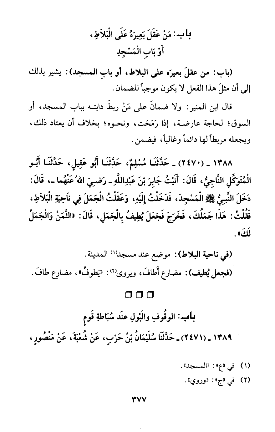 (باب: من عقلَ بعيرَه على البلاط، أو بابِ المسجد): يشير بذلك إلى أن مثلَ هذا الفعل لا يكون موجباً للضمان.