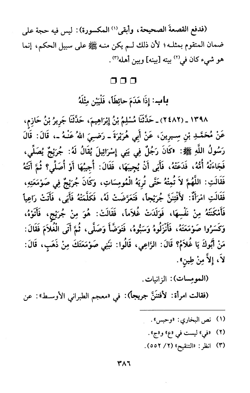 1398 - (2482) - حَدَّثَنَا مُسْلِمُ بْنُ إِبْرَاهِيمَ، حَدَّثَنَا جَرِيرُ بْنُ حَازِمٍ، عَنْ مُحَمَّدِ بْنِ سِيرِينَ، عَنْ أَبِي هُرَيْرَةَ -رَضِيَ اللهُ عَنْهُ-، قَالَ: قَالَ رَسُولُ اللهِ - صلى الله عليه وسلم -: "كَانَ رَجُلٌ فِي بَنِي إِسْرَائِيلَ يُقَالُ لَهُ: جُرَيْجٌ يُصَلِّي، فَجَاءَتْهُ أُمُّهُ، فَدَعَتْهُ، فَأبَى أَنْ يُجِيبَهَا، فَقَالَ: أُجِيبُهَا أَوْ أُصَلِّي؟ ثُمَّ أَتَتْهُ فَقَالَتِ: اللَّهُمَّ لاَ تُمِتْهُ حَتَّى تُرِيَهُ الْمُومِسَاتِ، وَكَانَ جُرَيْجٌ فِي صَوْمَعَتِهِ، فَقَالَتِ امْرَأَةٌ: لأَفْتِنَنَّ جُرَيْجاً، فَتَعَرضَتْ لَهُ، فَكَلَّمَتْهُ فَأَبَى، فَأَتَتْ رَاعِياً فَأَمْكَنَتْهُ مِنْ نَفْسِهَا، فَوَلَدَتْ غُلاَماً، فَقَالَتْ: هُوَ مِنْ جُرَيْجٍ، فَأَتَوْهُ، وَكَسَرُوا صَوْمَعَتَهُ، فَأَنْزَلُوهُ وَسَبُّوهُ، فَتَوَضَّأَ وَصَلَّى، ثُمَّ أَتَى الْغُلاَمَ فَقَالَ: مَنْ أَبُوكَ يَا غُلاَمُ؟ قَالَ: الرَّاعي، قَالُوا: نَبْنِي صَومَعَتَكَ مِنْ ذَهَبٍ، قَالَ: لاَ، إِلاَّ مِنْ طِينٍ".