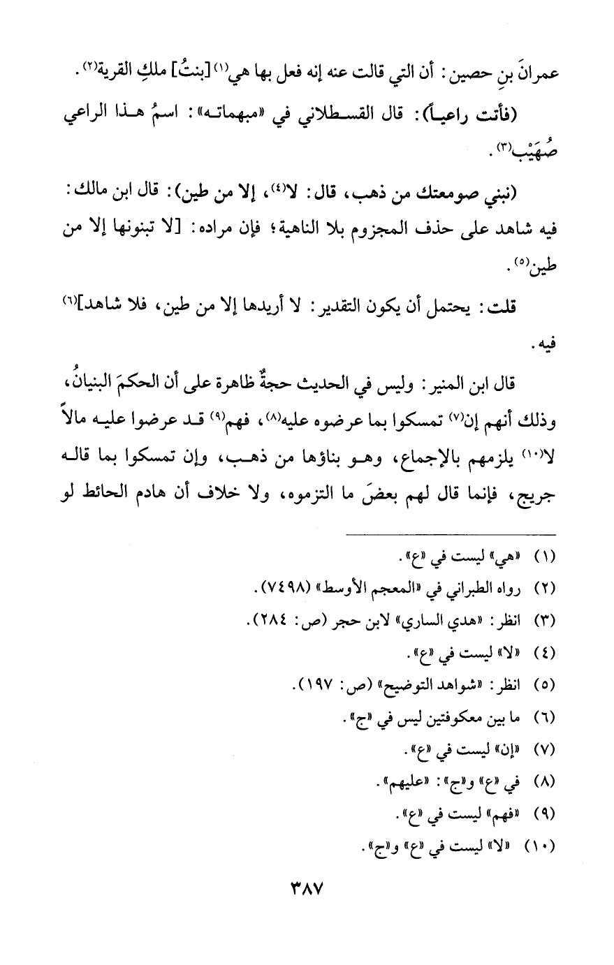 (نبني صومعتك من ذهب، قال: لا (¬4)، إلا من طين): قال ابن مالك: فيه شاهد على حذف المجزوم بلا الناهية؛ فإن مراده: [لا تبنونها إلا من طين (¬5).