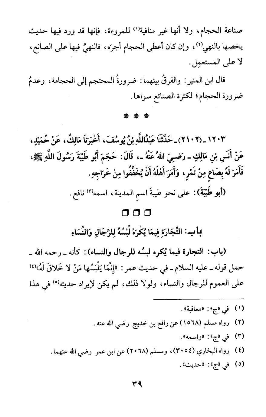 1203 - (2102) - حَدَّثَنَا عَبْدُ اللَّهِ بْنُ يُوسُفَ، أَخْبَرَنَا مَالِكٌ، عَنْ حُمَيْدٍ، عَنْ أَنَسَ بْنِ مَالِكِ - رَضِيَ اللهُ عَنْهُ -، قَالَ: حَجَمَ أَبُو طَيْبَةَ رَسُولَ اللَّهِ - صلى الله عليه وسلم -، فَأَمَرَ لَهُ بِصَاعٍ مِنْ تَمْرِ، وَأَمَرَ أَهْلَهُ أَنْ يُخَفِّفُوا مِنْ خَرَاجِهِ.
