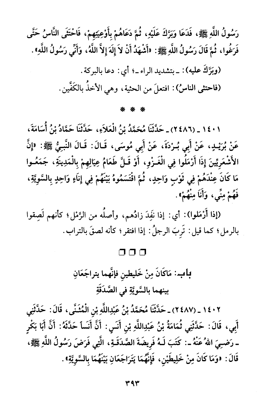 1401 - (2486) - حَدَّثَنَا مُحَمَّدُ بْنُ الْعَلاَءِ، حَدَّثَنَا حَمَّادُ بْنُ أُسَامَةَ، عَنْ بُرَيْدٍ، عَنْ أَبِي بُرْدَةَ، عَنْ أَبِي مُوسَى، قَالَ: قَالَ النَّبِيُّ - صلى الله عليه وسلم -: "إِنَّ الأَشْعَرِيِّينَ إِذَا أَرْمَلُوا فِي الْغَزْوِ، أَوْ قَلَّ طَعَامُ عِيَالِهِمْ بِالْمَدِينَةِ، جَمَعُوا مَا كَانَ عِنْدَهُمْ فِي ثَوْبٍ وَاحِدٍ، ثُمَّ اقْتَسَمُوهُ بَيْنَهُمْ فِي إِنَاءً وَاحِدٍ بِالسَّوِيَّةِ، فَهُمْ مِنِّي، وَأَناَ مِنْهُمْ".