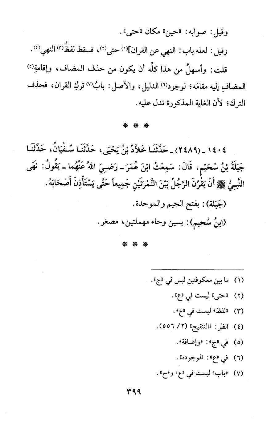 1404 - (2489) - حَدَّثَنَا خَلاَّدُ بْنُ يَحْيَى، حَدَّثَنَا سُفْيَانُ، حَدَّثَنَا جَبَلَةُ بْنُ سُحَيْمٍ، قَالَ: سَمِعْتُ ابْنَ عُمَرَ -رَضِيَ اللهُ عَنْهُما- يَقُولُ: نَهَى النَّبِيُّ - صلى الله عليه وسلم - أَنْ يَقْرُنَ الرَّجُلُ بَيْنَ التَّمْرَتَيْنِ جَمِيعاً حَتَّى يَسْتَأْذِنَ أَصْحَابَهُ.