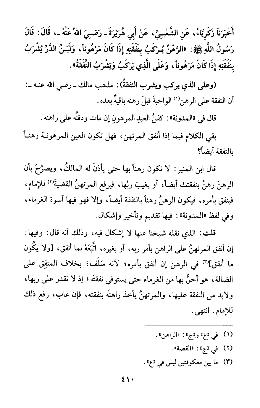 أَخْبَرَنَا زَكَرِيَّاءُ، عَنِ الشَّعْبِيِّ، عَنْ أَبِي هُرَيْرَةَ -رَضِيَ اللهُ عَنْهُ-، قَالَ: قَالَ رَسُولُ اللهِ - صلى الله عليه وسلم -: "الرَّهْنُ يُرْكَبُ بِنَفَقَتِهِ إِذَا كَانَ مَرْهُوناً، وَلَبَنُ الدَّرِّ يُشْرَبُ بِنَفَقَتِهِ إِذَا كَانَ مَرْهُوناً، وَعَلَى الَّذِي يَرْكَبُ وَيَشْرَبُ النَّفَقَةُ".