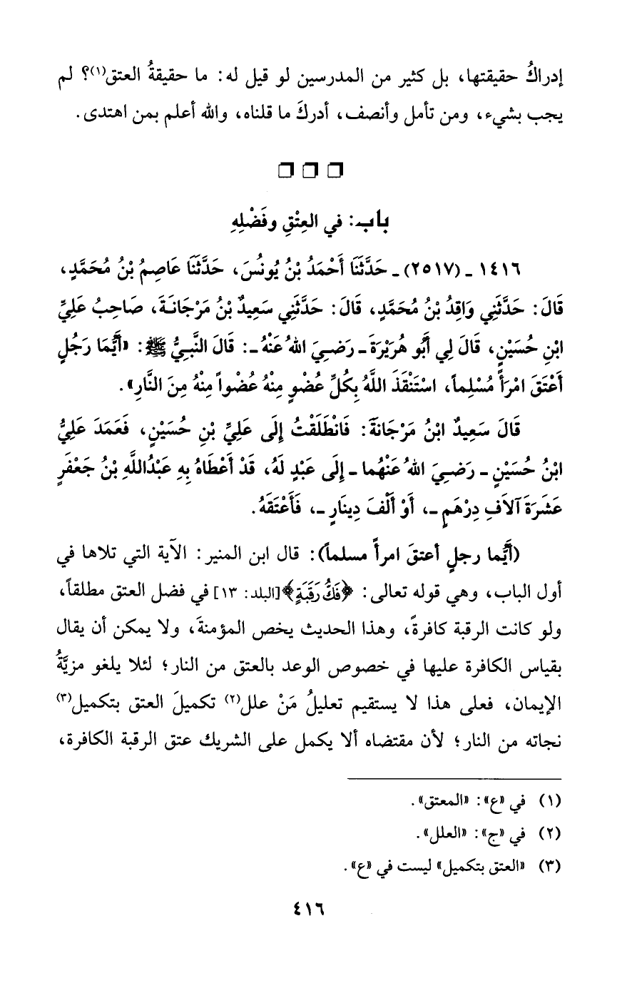 1416 - (2517) - حَدَّثَنَا أَحْمَدُ بْنُ يُونُسَ، حَدَّثَنَا عَاصِمُ بْنُ مُحَمَّدٍ، قَالَ: حَدَّثَنِي وَاقِدُ بْنُ مُحَمَّدٍ، قَالَ: حَدَّثَنِي سَعِيدٌ بْنُ مَرْجَانَةَ، صَاحِبُ عَلِيِّ ابْنِ حُسَيْنٍ، قَالَ لِي أَبُو هُرَيْرَةَ -رَضِيَ اللهُ عَنْهُ-: قَالَ النَّبيُّ - صلى الله عليه وسلم -: "أَيُّمَا رَجُلٍ أَعْتَقَ امْرَأً مُسْلِماً، اسْتَنْقَذَ اللهُ بِكُلِّ عُضْوٍ مِنْهُ عُضْواً مِنْهُ مِنَ النَّارِ".
