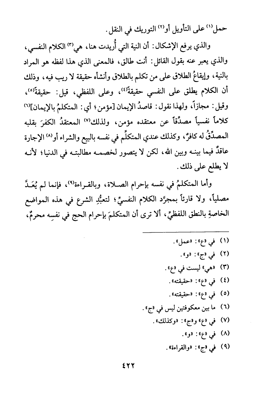 والذي يرفع الإشكال: أن النية التي أُريدت هنا، هي (¬3) الكلام النفسي، والذي يعبر عنه بقول القائل: أنت طالق، فالمعنى الذي هذا لفظه هو المراد بالنية، وإيقاعُ الطلاق على من تكلم بالطلاق وأنشأه حقيقة لا ريب فيه، وذلك أن الكلام يطلق على النفسي حقيقةً (¬4)، وعلى اللفظي، قيل: حقيقةً (¬5)، وقيل: مجازاً، ولهذا نقول: قاصدُ الإيمان [مؤمن؛ أي: المتكلمُ بالإيمان] (¬6) كلاماً نفسياً مصدقاً عن معتقده مؤمن، ولذلك (¬7) المعتقدُ الكفرَ بقلبه المصدِّقُ له كافرٌ، وكذلك عندي المتكلِّم في نفسه بالبيع والشراء أو (¬8) الإجارة عاقدٌ فيما بينه وبين الله، لكن لا يتصور لخصمه مطالبته في الدنيا؛ لأنه لا يطلع على ذلك.