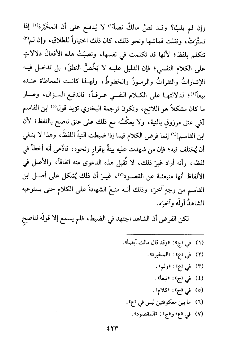 وإن لم يلبِّ؟ وقد نصَّ مالكٌ نصاً (¬1) لا يُدفع على أن المخَيَّرة (¬2) إذا تستَّرَتْ، ونقلت قماشها ونحو ذلك، كان ذلك اختياراً للطلاق، وإن لم (¬3) تتكلم بلفظ؛ لأنها قد تكلمت في نفسها، ونصبَتْ هذه الأفعالَ دلالاتٍ على الكلام النفسي؛ فإن الدليل عليه لا يَخُصُّ النطقَ، بل تدخل فيه الإشاراتُ والنقراتُ والرموزُ والخطوطُ، ولهذا كانت المعاطاة عنده بيعاً (¬4)؛ لدلالتها على الكلام النفسي عرفاً، فاندفع السؤال، وصار ما كان مشكلاً هو اللائح، وتكون ترجمة البخاري تؤيد قول (¬5) ابن القاسم [في عتق مرزوقٍ بالنية، ولا يعكُسُه مع ذلك على عتق ناصح باللفظ؛ لأن ابن القاسم] (¬6) إنما فرض الكلام فيما إذا ضبطت النيةُ اللفظَ، وهذا لا ينبغي أن يُختلف فيه؛ فإن من شهدت عليه بينةٌ بإقرارٍ ونحوه، فادَّعى أنه أخطأ في لفظه، وأنه أراد غيرَ ذلك، لا تُقبل هذه الدعوى منه اتفاقاً، والأصل في الألفاظ أنها منبعثة عن القصود (¬7)، غيرَ أن ذلك يُشكل على أصل ابن القاسم من وجهٍ آخرَ، وذلك أنه منعَ الشهادةَ على الكلام حتى يستوعبه الشاهدُ أولَه وآخرَه.