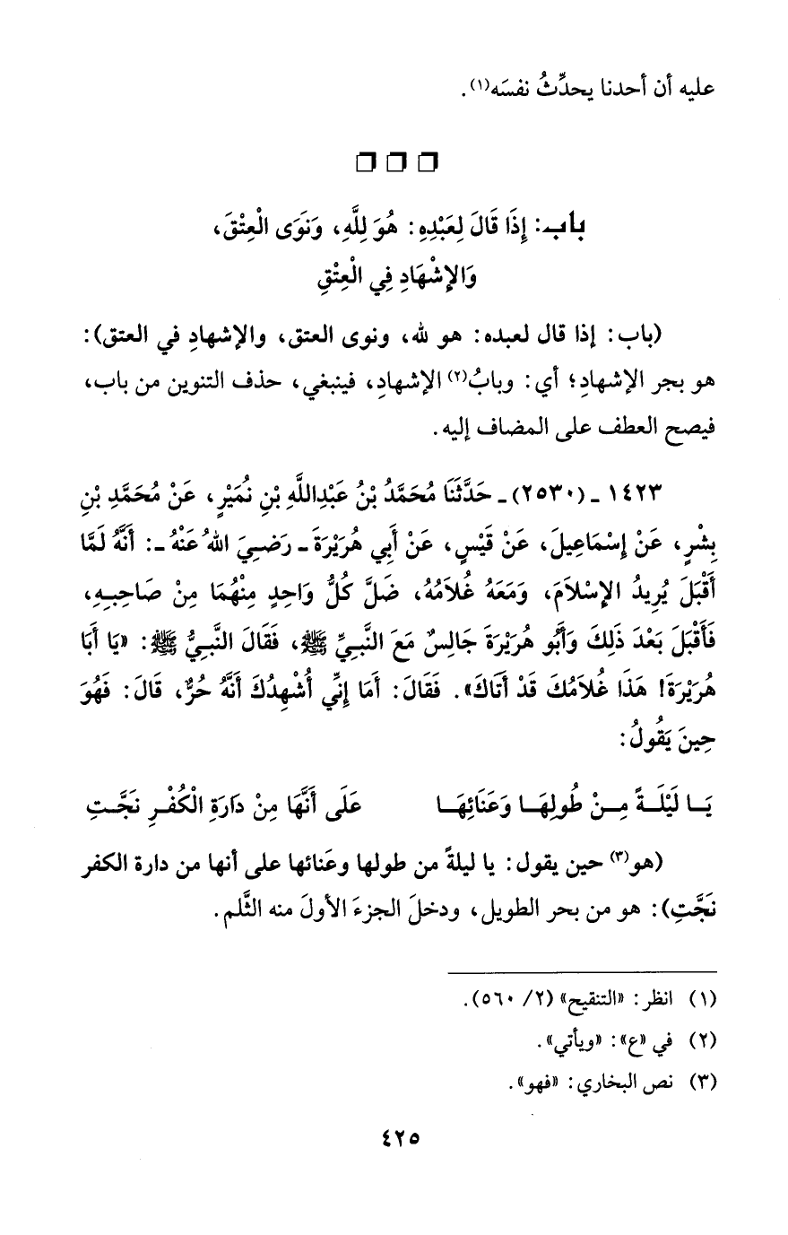 1423 - (2530) - حَدَّثَنَا مُحَمَّدُ بْنُ عَبْدِ اللهِ بْنِ نُمَيْرٍ، عَنْ مُحَمَّدِ بْنِ بِشْرٍ، عَنْ إسْمَاعِيلَ، عَنْ قَيْسٍ، عَنْ أَبِي هُرَيْرَةَ -رَضِيَ اللهُ عَنْهُ-: أَنَّهُ لَمَّا أَقْبَلَ يُرِيدُ الإِسْلاَمَ، وَمَعَهُ غُلاَمُهُ، ضَلَّ كُلُّ وَاحِدٍ مِنْهُمَا مِنْ صَاحِبِهِ، فَأقْبَلَ بَعْدَ ذَلِكَ وَأَبُو هُرَيْرَةَ جَالِسٌ مَعَ النَّبِيِّ - صلى الله عليه وسلم -، فَقَالَ النَّبِيُّ - صلى الله عليه وسلم -: "يَا أَبَا هُرَيْرَةَ! هَذَا غُلاَمُكَ قَدْ أَتَاكَ". فَقَالَ: أَمَا إِنِّي أُشْهِدُكَ أَنَّهُ حُرٌّ، قَالَ: فَهُوَ حِينَ يَقُولُ: