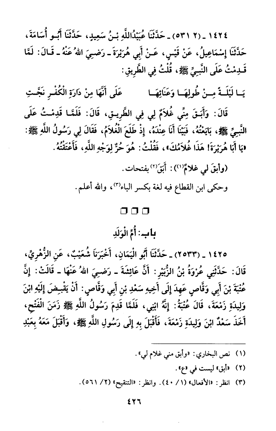 1425 - (2533) - حَدَّثَنَا أَبُو الْيَمَانِ، أَخْبَرَنَا شُعَيْبٌ، عَنِ الزُّهْرِيِّ، قَالَ: حَدَّثَنِي عُرْوَةُ بْنُ الزُّبَيْرِ: أَنَّ عَائِشَةَ -رَضِيَ اللهُ عَنْهَا- قَالَتْ: إِنَّ عُتْبَةَ بْنَ أَبِي وَقَّاصٍ عَهِدَ إِلَى أَخِيهِ سَعْدِ بْنِ أَبِي وَقَّاصٍ: أَنْ يَقْبِضَ إِلَيْهِ ابْنَ وَلِيدَةِ زَمْعَةَ، قَالَ عُتْبَهَ: إِنَّهُ ابْنِي، فَلَمَّا قَدِمَ رَسُولُ اللهِ - صلى الله عليه وسلم - زَمَنَ الْفَتْحِ، أَخَذَ سَعْدٌ ابْنَ وَلِيدَةِ زَمْعَةَ، فَأَقْبَلَ بِهِ إِلَى رَسُولِ اللهِ - صلى الله عليه وسلم -، وَأَقْبَلَ مَعَهُ بِعَبْدِ
