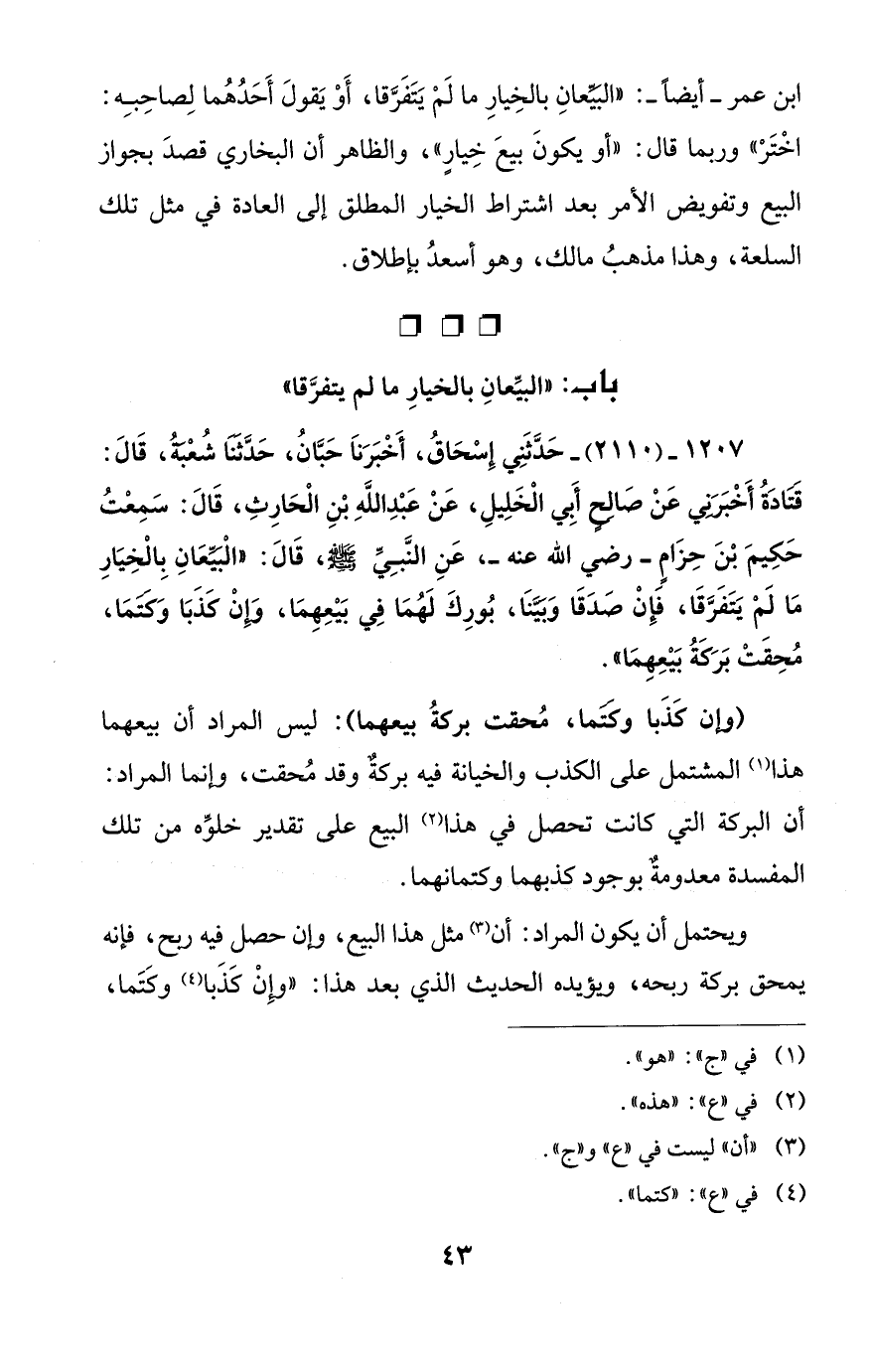 1207 - (2110) - حَدَّثَنِي إِسْحَاقُ، أَخْبَرَناَ حَبَّانُ، حَدَّثَنَا شُعْبَةُ، قَالَ: قَتَادَةُ أَخْبَرَنِي عَنْ صَالِحٍ أَبِي الْخَلِيلِ، عَنْ عَبْدِ اللهِ بْنِ الْحَارِثِ، قَالَ: سَمِعْتُ حَكِيمَ بْنَ حِزَامٍ -رضي الله عنه-، عَنِ النَّبِيِّ - صلى الله عليه وسلم -، قَالَ: "الْبَيِّعَانِ بِالْخِيَارِ مَا لَمْ يَتَفَرَّقَا، فَإِنْ صَدَقَا وَبَيَّنَا، بُورِكَ لَهُمَا فِي بَيْعِهِمَا، وَإِنْ كَذَبَا وَكَتَمَا، مُحِقَتْ بَرَكَةُ بَيْعِهِمَا".