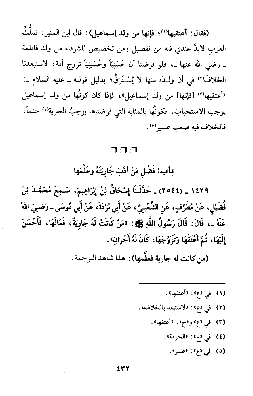 1429 - (2544) - حَدَّثَنَا إِسْحَاقُ بْنُ إِبْرَاهِيمَ، سَمِعَ مُحَمَّدَ بْنَ فُضَيْلٍ، عَنْ مُطَرِّفٍ، عَنِ الشَّعْبِيِّ، عَنْ أَبِي بُرْدَةَ، عَنْ أَبِي مُوسَى -رَضِيَ اللهُ عَنْهُ-، قَالَ: قَالَ رَسُولُ اللهِ - صلى الله عليه وسلم -: "مَنْ كَانَتْ لَهُ جَارِيَةٌ، فَعَالَهَا، فَأَحْسَنَ إلَيْهَا، ثُمَّ أَعْتَقَهَا وَتَزَوجَهَا، كَانَ لَهُ أَجْرَانِ".