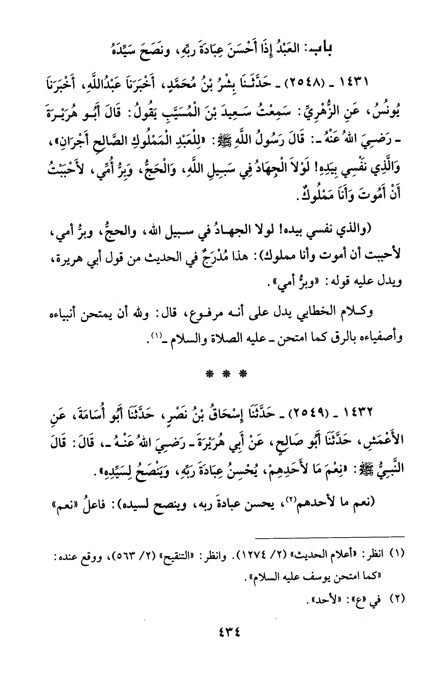 1431 - (2548) - حَدَّثَنَا بِشْرُ بْنُ مُحَمَّدٍ، أَخْبَرَنَا عَبْدُ اللهِ، أَخْبَرَنَا يُونُسُ، عَنِ الزُّهْرِيِّ: سَمِعْتُ سَعِيدَ بْنَ الْمُسَيَّبِ يَقُولُ: قَالَ أَبُو هُرَيْرَةَ -رَضِيَ اللهُ عَنْهُ-: قَالَ رَسُولُ اللهِ - صلى الله عليه وسلم -: "لِلْعَبْدِ الْمَمْلُوكِ الصَّالِحِ أَجْرَانِ"، وَالَّذِي نَفْسِي بِيَدِهِ! لَوْلاَ الْجِهَادُ فِي سَبِيلِ اللهِ، وَالْحَجُّ، وَبِرُّ أُمُّي، لأَحْبَبْتُ أَنْ أَمُوتَ وَأَناَ مَمْلُوكٌ.