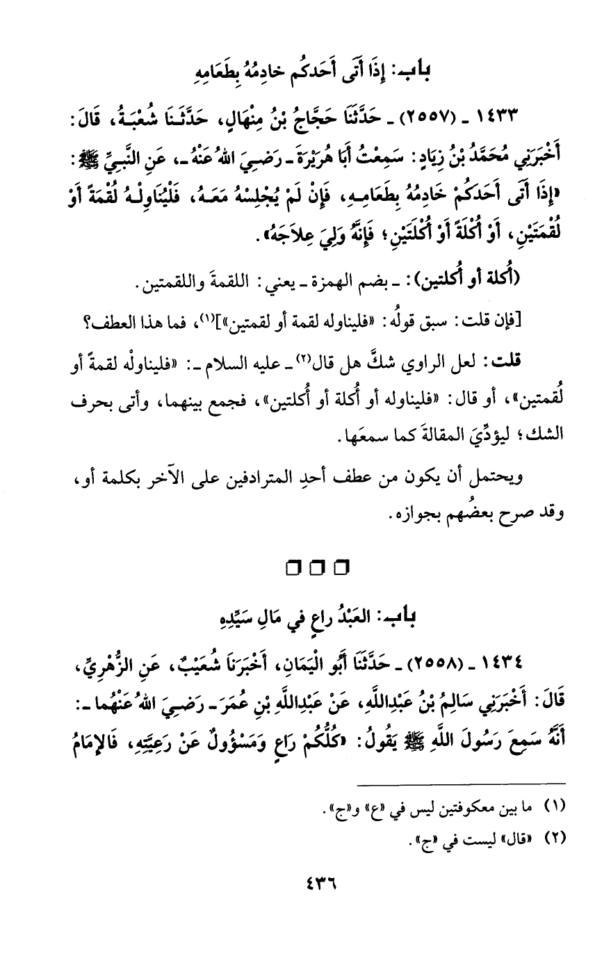 1433 - (2557) - حَدَّثَنَا حَجَّاجُ بْنُ مِنْهَالٍ، حَدَّثَنَا شُعْبَةُ، قَالَ: أَخْبَرَنِي مُحَمَّدُ بْنُ زِيَادٍ: سَمِعْتُ أَبَا هُرَيْرَةَ -رَضِيَ اللهُ عَنْهُ-، عَنِ النَّبِيِّ - صلى الله عليه وسلم -: "إِذَا أَتَى أَحَدَكُمْ خَادِمُهُ بِطَعَامِهِ، فَإِنْ لَمْ يُجْلِسْهُ مَعَهُ، فَلْيُنَاوِلْهُ لُقْمَةً أَوْ لُقْمَتَيْنِ، أَوْ أُكْلَةً أَوْ أُكْلَتَيْنِ؛ فَإِنَّهُ وَلِيَ عِلاَجَهُ".
