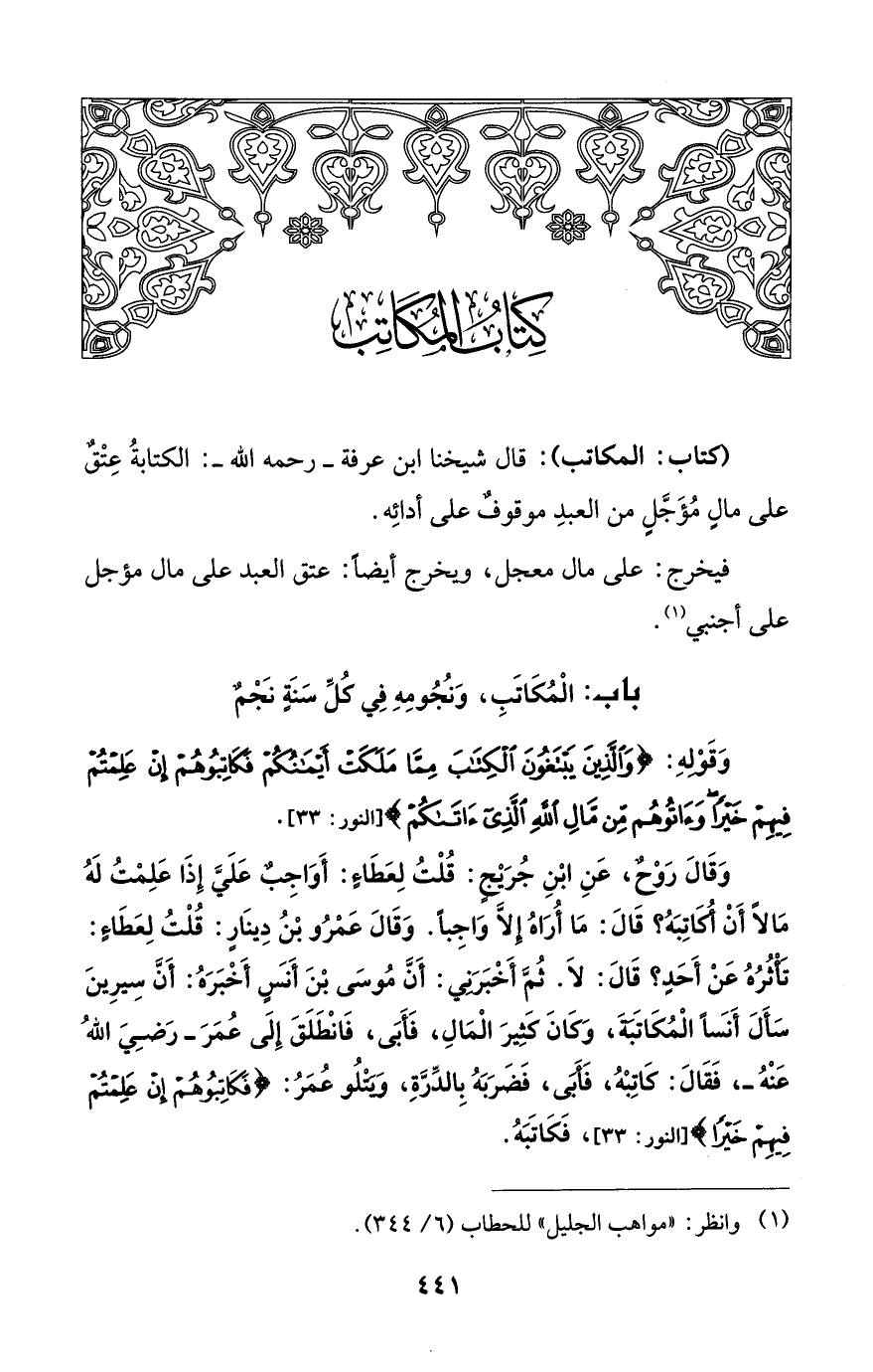 (كتاب: المكاتب): قال شيخنا ابن عرفة -رحمه الله-: الكتابةُ عِتْقٌ على مالٍ مُؤَجَّلٍ من العبدِ موقوفٌ على أدائِه.